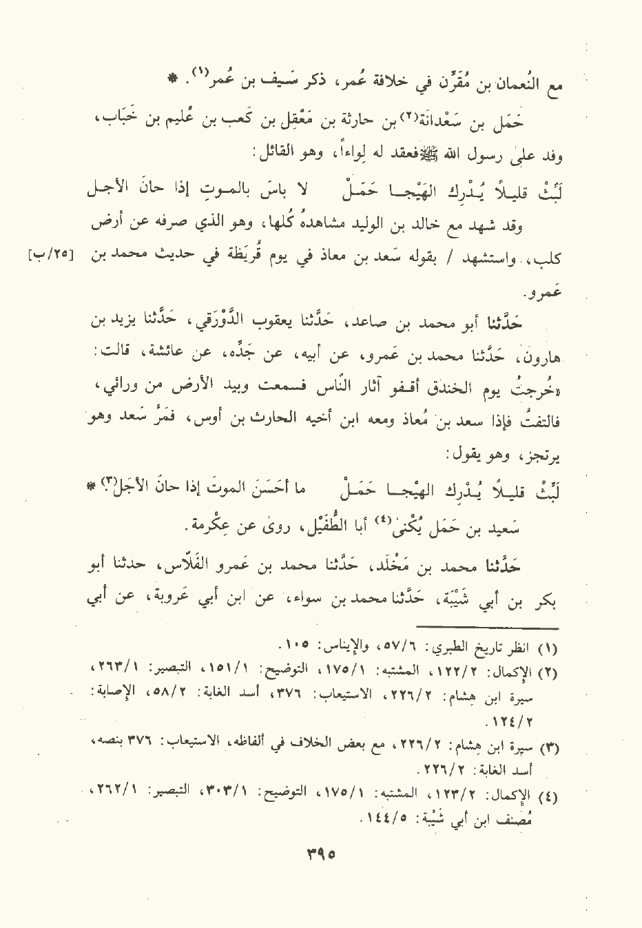 حَدَّثَنا أبو مُحمَّد بن صَاعِد , حَدَّثَنا يَعْقُوب الدَّوْرَقي , حَدَّثَنا يَزِيد بن هارون , حَدَّثَنا مُحمَّد بن عَمْرو , عَن أبيه , عن جده , عن عائشة قالت: خرجت يوم الخَنْدق أقفو آثار الناس فسمعت وبيد الأرض من ورائي فالتفت فإذا سَعْد بن مُعاذ ومعه ابن أخيه الحارث بن أوس فمر سَعْد وهو يرتجز وهو يقول:
