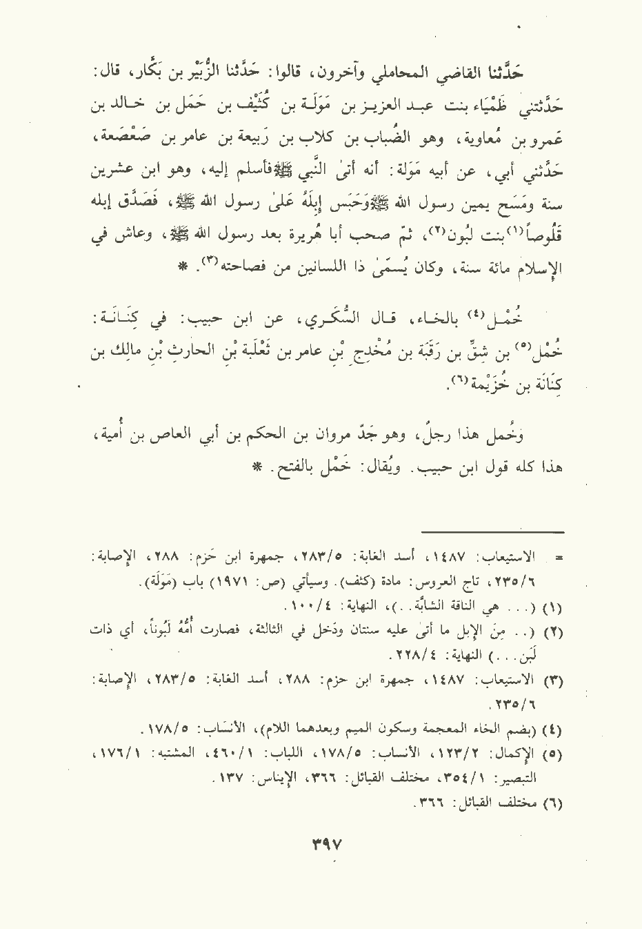 حَدَّثَنا القاضي المَحَامِلي وآخرون قالوا: حَدَّثَنا الزُّبَيْر بن بَكَّار قال: حدثتني ظَمْيَاء بنت عبد العزيز بن مولة بن كُثَيْف بن حَمَل بن خالد بن عَمْرو بن مُعَاوية وهو الضُبَاب بن كلاب بن رَبِيعَة بن عامر بن صَعْصَعَة حَدَّثني أبي , عَن أبيه مَوَلة: أنه أتى النَّبِيّ صلى الله عليه وسلم فأسلم إليه وهو ابن عشرين سنة ومسح يمين رسول الله صلى الله عليه وسلم , وحبس إبله على رسول الله صلى الله عليه وسلم , فصدق إبله قَلُوصًا بنت لبون , ثم صحب أبا هُرَيْرة بعد رسول الله صلى الله عليه وسلم وعاش في الإسلام مِئَة سنة , وكان يسمى ذا اللسانين من فصاحته.
