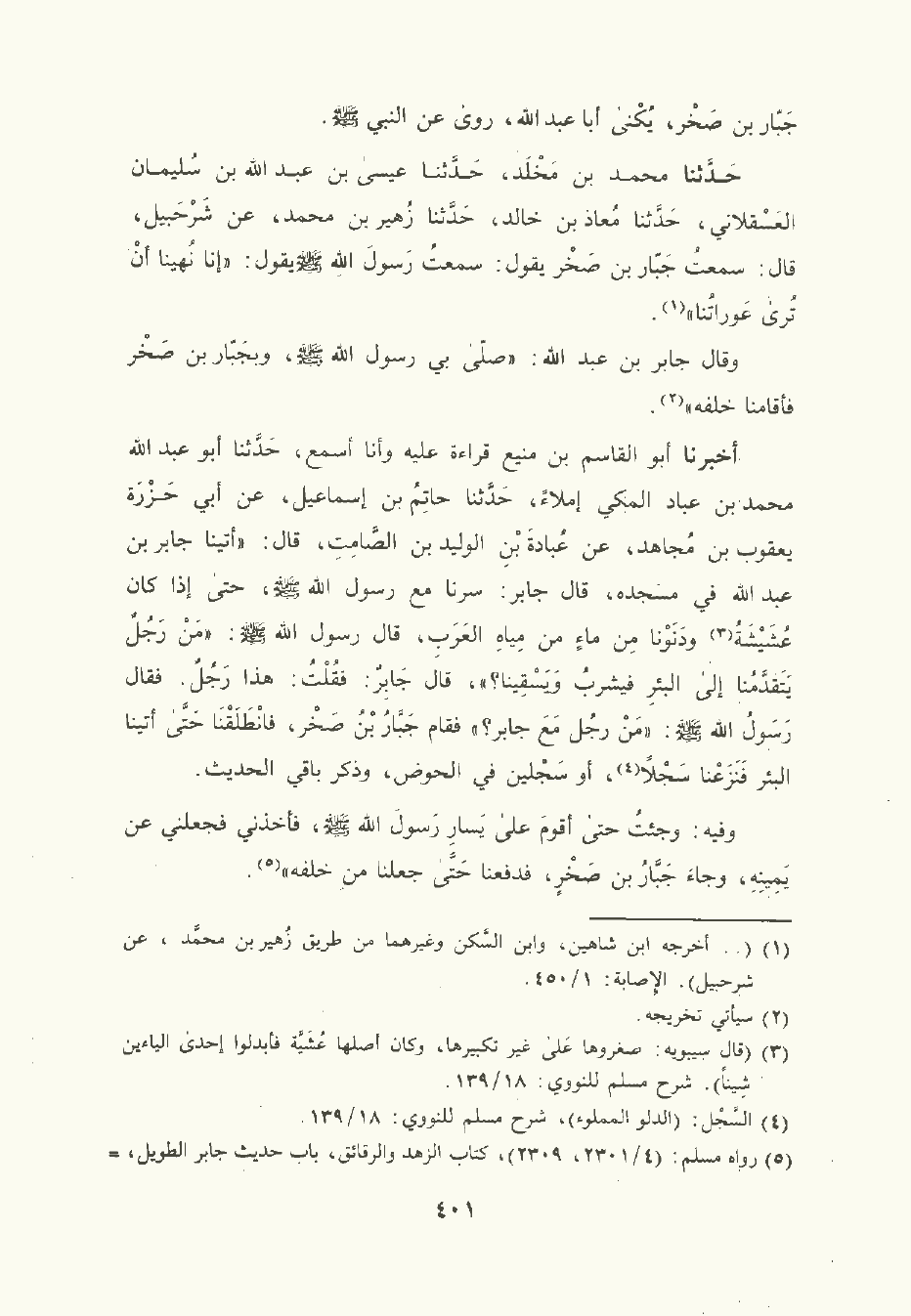 أخبرنا أبو القَاسِم بن منيع قراءة عليه وأنا اسمع , حَدَّثَنا أبو عبد الله مُحمَّد بن عباد المَكِّي إملاءً , حَدَّثَنا حاتم بن إسماعيل , عَن أبي حَزْرَة يَعْقُوب بن مُجَاهد , عن عُبَادة بن الوليد بن الصَّامت قال: أتينا جابر بن عبد الله في مسجده قال جابر: سرنا مع رسول الله صلى الله عليه وسلم حتى إذا كان عشيشة ودنونا من ماء من مياه العرب قال رسول الله صلى الله عليه وسلم: من رجل يتقدمنا إلى البئر فيشرب ويسقينا؟ قال جابر: فقلت: هذا رجل. فقال رسول الله صلى الله عليه وسلم: من رجل مع جابر؟ فقام جبار بن صخر فانطلقنا حتى أتينا البئر فنزعنا سَجْلاً أو سَجْلَين في الحوض وذكر باقي الحديث.