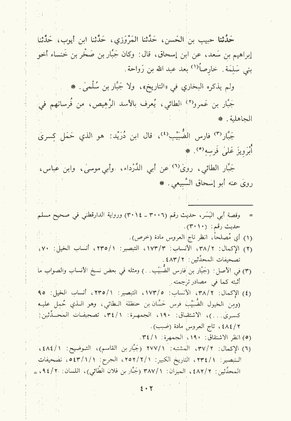 حَدَّثَنا حبيب بن الحسن , حَدَّثَنا المَرْوَزِيُّ , حَدَّثَنا ابن أَيُّوب , حَدَّثَنا إبراهيم بن سَعْد , عن ابن إسحاق قال: وكان جَبَّار بن صَخْر بن خَنْسَاء أخو بني سَلِمَة. خارصًا بعد عَبد الله بن رواحة.