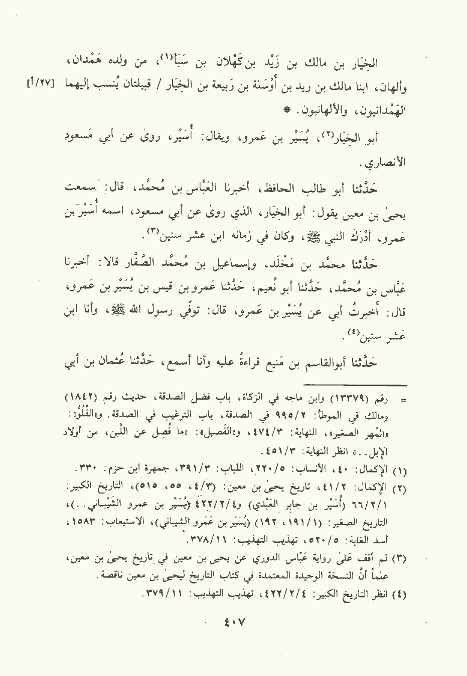 حَدَّثَنا أبو طالب الحافظ أخبرنا العَبَّاس بن مُحمَّد قال: سَمِعتُ يَحْيى بن مَعِين يقول: أبو الخِيَار الَّذي رَوَى عَن أبي مسعود اسمه أسير بن عَمْرو أدرك النَّبِيّ صلى الله عليه وسلم وكان في زمانه ابن عشر سنين.