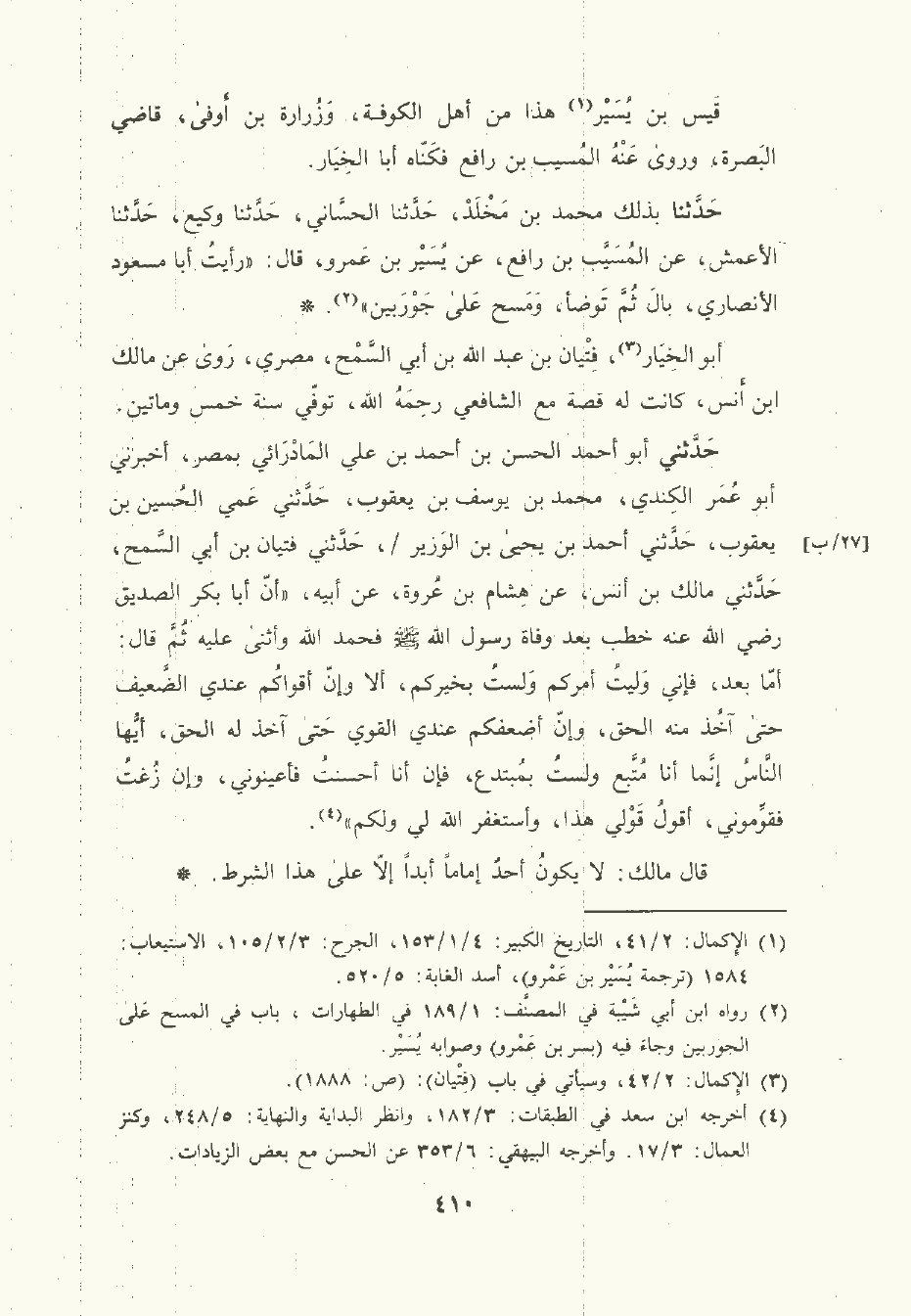 حَدَّثَنا بذلك مُحمَّد بن مَخْلَد، حَدَّثَنا الحَسَّاني , حَدَّثَنا وَكِيع , حَدَّثَنا الأَعْمش , عن المُسَيَّب بن رافع , عن يُسَيْر بن عَمْرو قال: رأيت أبا مسعود الأَنْصَاري بال ثم توضأ ومسح على جوربين.
