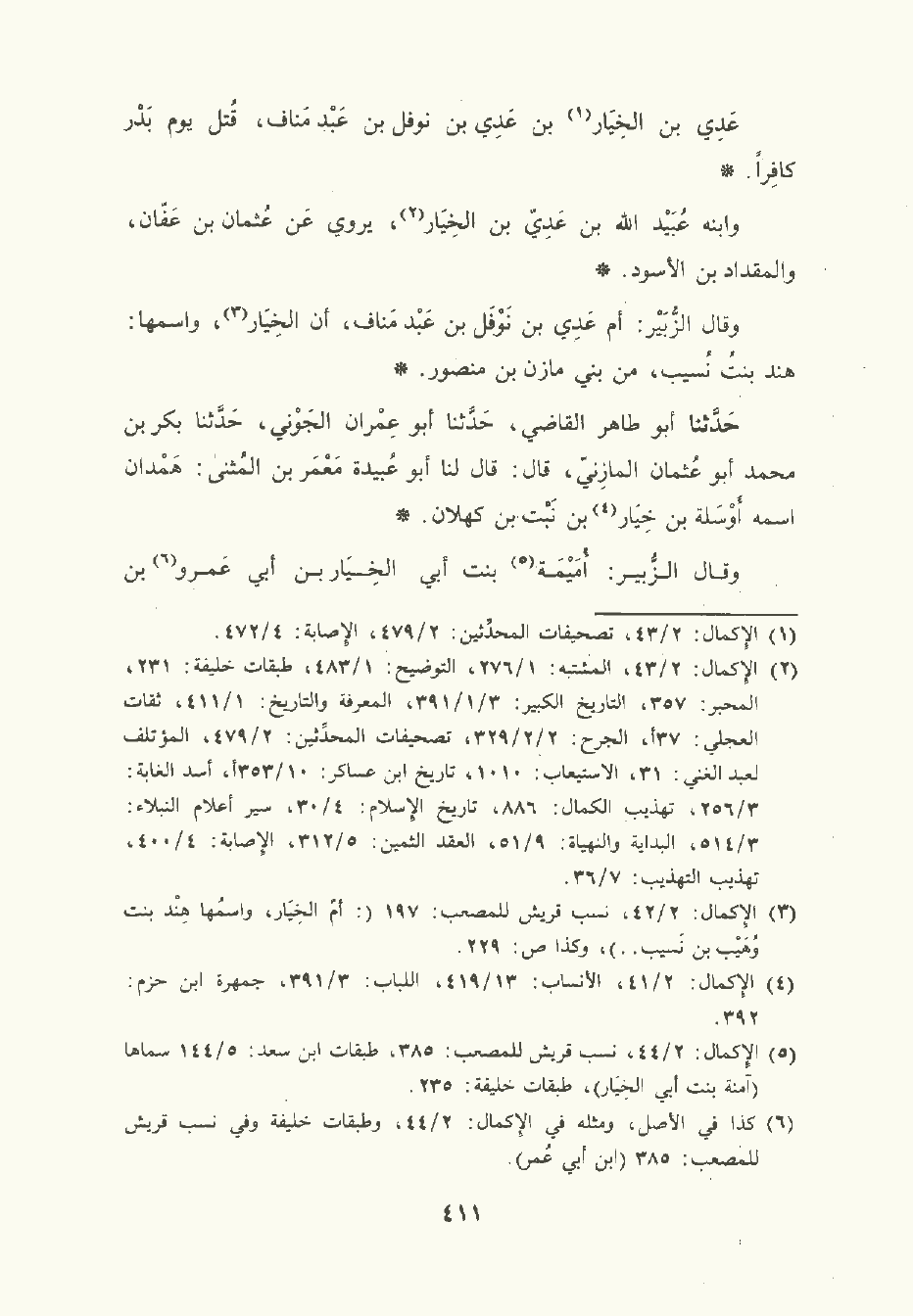 وقال الزُّبَيْر: أم عدي بن نوفل بن عَبد مَنَاف , أم الخيار واسمها: هِنْد بنت نُسَيْب من بني مازن بن مَنْصُور.