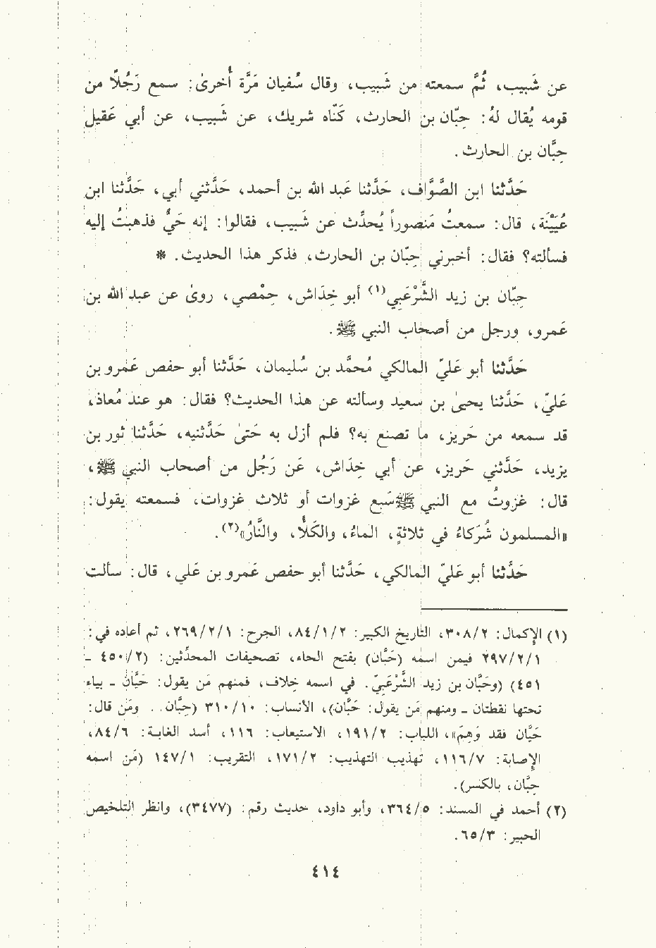حَدَّثَنا ابن الصَّوَّاف , حَدَّثَنا عَبد الله بن أحمد حَدَّثني أبي , حَدَّثَنا ابن عُيَيْنة قال: سَمِعتُ منصورا يُحَدِّث عن شبيب فقالوا: إنه حي فذهبت إليه فسألته؟ فقال: أَخْبَرني حِبَّان بن الحارث فذكر هذا الحديث.