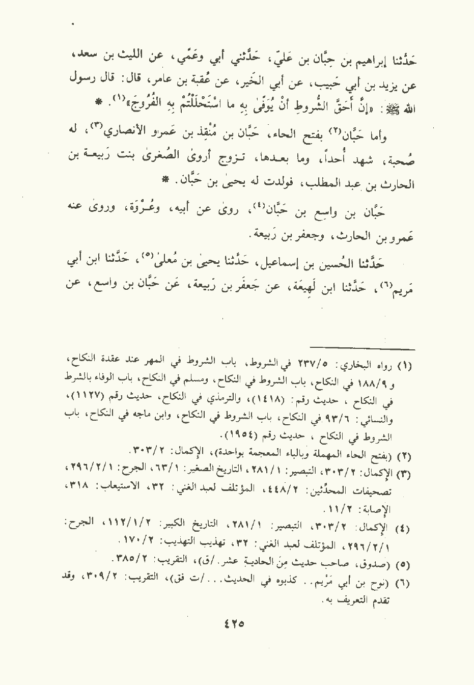 حَدَّثَنا إبراهيم بن حِبَّان بن علي حَدَّثني أبي وعَمِّي , عن اللَّيْث بن سَعْد , عن يَزِيد بن أبي حبيب , عَن أبي الخَيْر , عن عُقْبة بن عامر قال: قال رسول الله صلى الله عليه وسلم: إن أحق الشروط أن يوفى به ما استحللتم به الفروج.