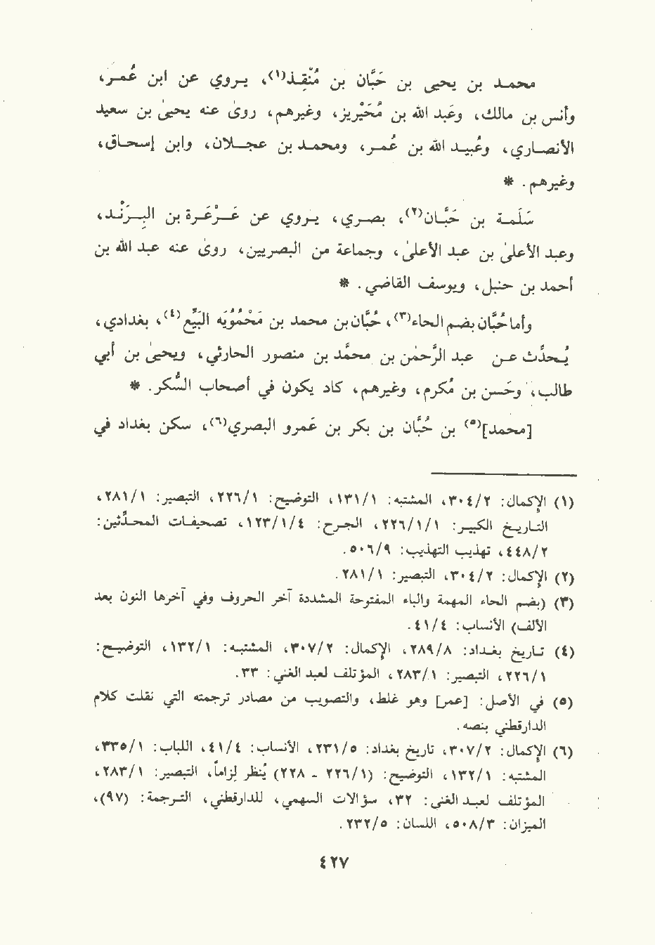 وأمَّا حُبَّان بضم الحاء حبان بن مُحمَّد بن مَحْمُويَه البَيِّع بغدادي يُحَدِّث عن عَبد الرَّحْمن بن مُحمَّد بن مَنْصُور الحارثي ويَحْيى بن أبي طالب وحسن بن مُكَرم وغيرهم كاد يكون في أصحاب السُّكر.