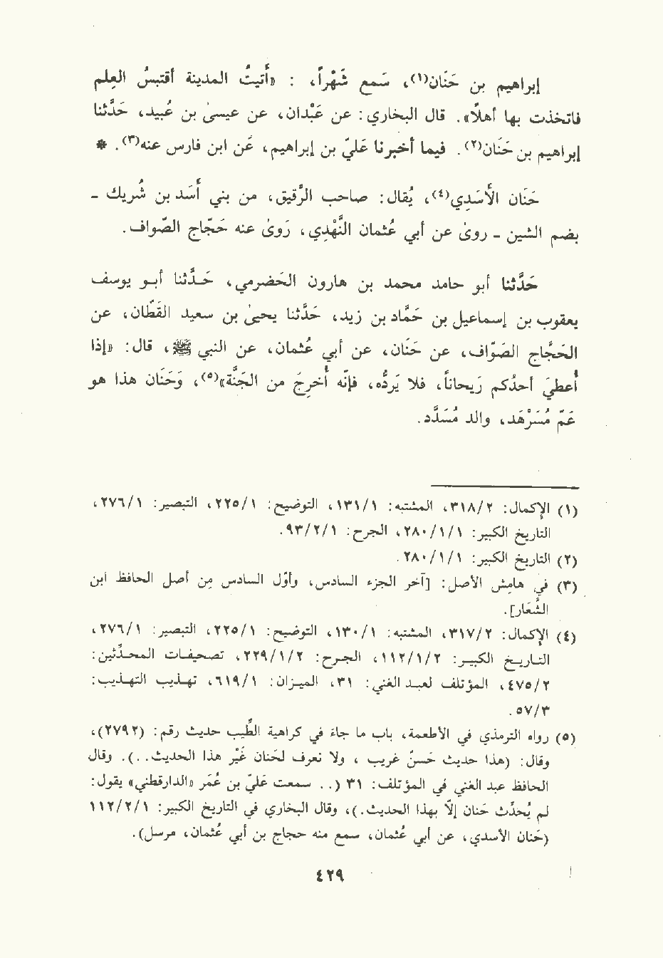 إبراهيم بن حَنَان سمع شهرا: أتيت المدينة أقتبس العلم فاتخذت بها أهلا. قال البُخَاري: عن عبدان , عن عيسى بن عُبَيْد , حَدَّثَنا إبراهيم بن حنان. فيما أخبرنا علي بن إبراهيم , عن ابن فارس عنه.