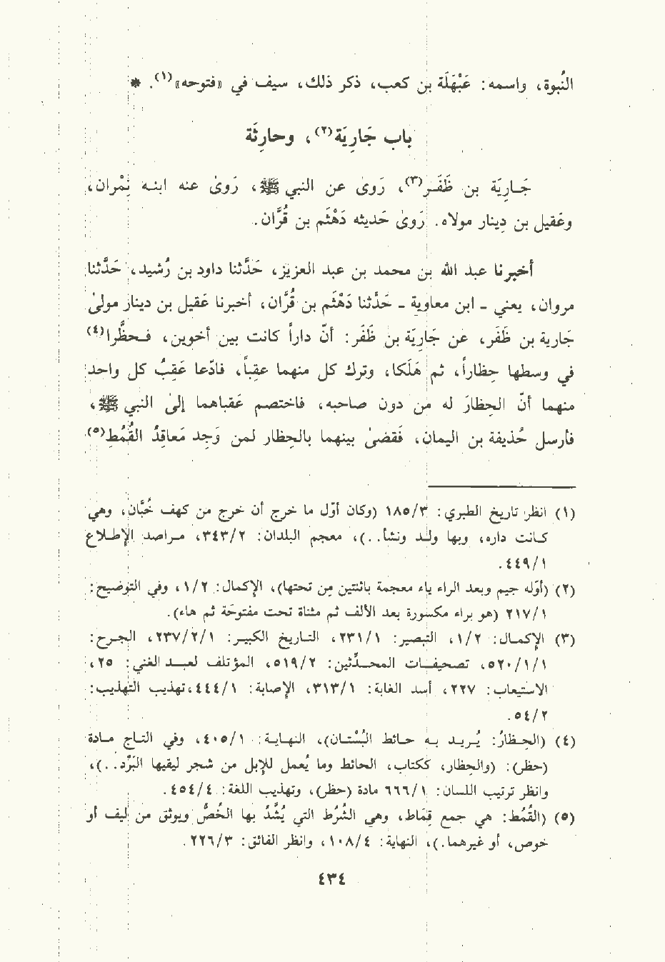 أخبرنا عَبد الله بن مُحمَّد بن عبد العزيز , حَدَّثَنا داود بن رُشَيْد , حَدَّثَنا مروان يعني ابن مُعَاوية , حَدَّثَنا دَهْثَم بن قُرَّان أخبرنا عَقِيل بن دِينَار مولى جَارِيَة بن ظَفَر , عن جَارَيَة بن ظَفَر: أن دارا كانت بين أخوين فحظر في وسطها حظارا ثم هلكا وترك كل منهما عقبا فادعا عقب كل واحد منهما أن الحظار له من دون صاحبه فاختصم عقباهما إلى النَّبِيّ صلى الله عليه وسلم فأرسل حُذَيْفَة بن اليمان فقضى بينهما بالحظار لمن وجد معاقد القمط تليه ثم رجع فأخبر النَّبِيّ صلى الله عليه وسلم فقال النَّبِيّ صلى الله عليه وسلم: أصبت أو قال: أحسنت.