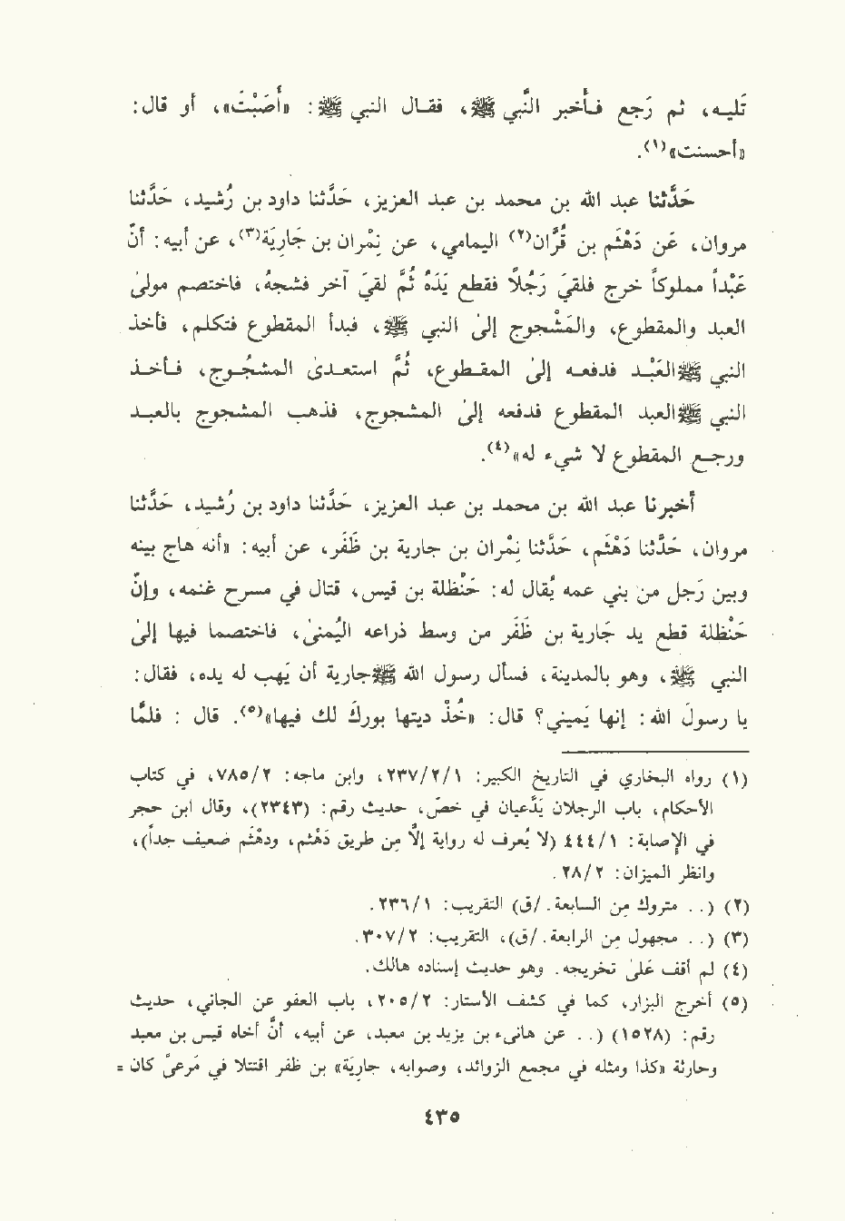 حَدَّثَنا عَبد الله بن مُحمَّد بن عبد العزيز , حَدَّثَنا داود بن رشيد , حَدَّثَنا مروان , عن دَهْثَم بن قُرَّان اليمامي , عن نِمْران بن جَارِيَة , عَن أبيه: أن عبدا مملوكا خرج فلقى رجلا فقطع يده ثم لقى آخر فشجه فاختصم مولى العبد والمقطوع والمشجوج إلى النَّبِيّ صلى الله عليه وسلم فبدأ المقطوع فتكلم فأخذ النَّبِيّ صلى الله عليه وسلم العبد فدفعه إلى المقطوع ثم استعدى المشجوج فأخذ النَّبِيّ صلى الله عليه وسلم العبد المقطوع فدفعه إلى المشجوج فذهب المشجوج بالعبد ورجع المقطوع لا شيء له.