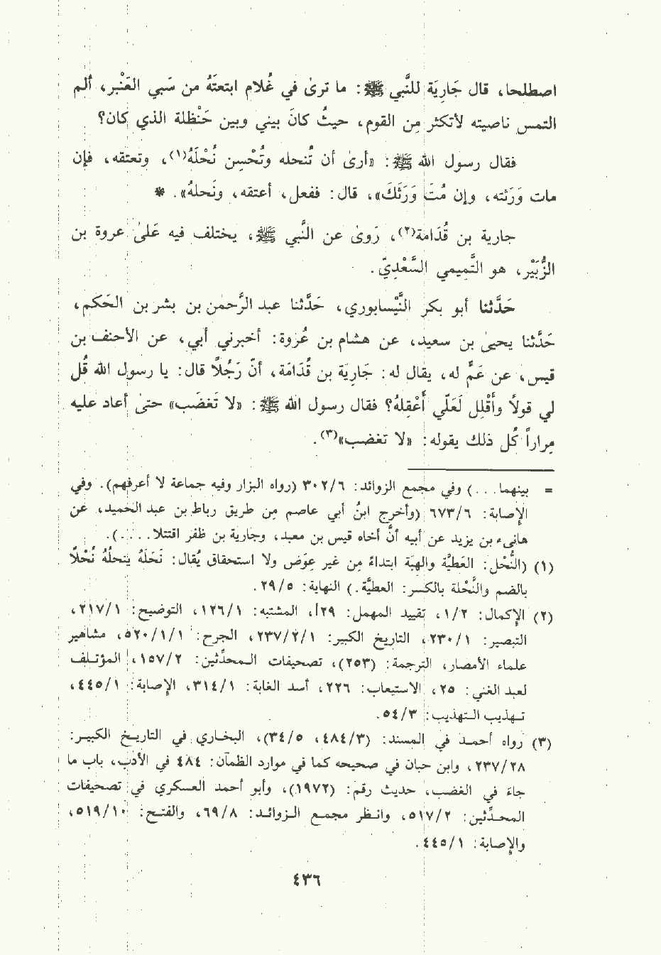 حَدَّثَنا أبو بَكْر النَّيْسَابوري , حَدَّثَنا عبد الرَّحْمن بن بشر بن الحَكَم , حَدَّثَنا يَحْيى بن سَعِيد , عن هشام بن عُرْوة: أَخْبَرني أبي , عن الأَحْنَف بن قَيْس , عن عم له يقال له: جَارِيَة بن قُدَامَة أن رجلا قال: يا رسول الله قل لي قولا وأقلل لعلي أعقله؟ فقال رسول الله صلى الله عليه وسلم: لا تغضب حتى أعاد عليه مرارا كل ذلك يقوله: لا تغضب.