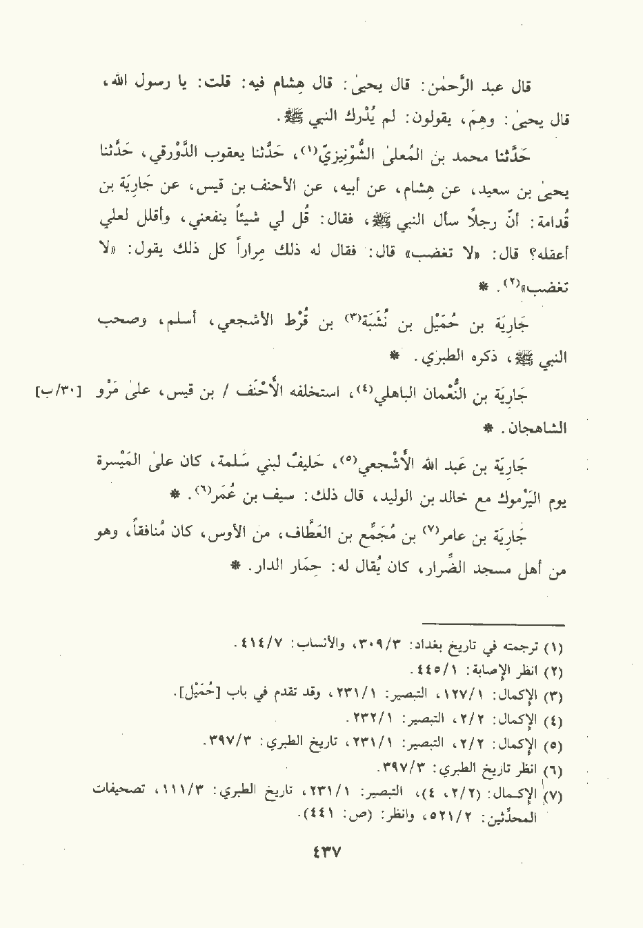 حَدَّثَنا مُحمَّد بن المُعَلَّى الشُّونِيزيّ , حَدَّثَنا يَعْقُوب الدَّوْرَقي , حَدَّثَنا يَحْيى بن سَعِيد , عن هشام , عَن أبيه , عن الأَحْنَف بن قَيْس , عن جَارِيَة بن قُدَامَة: أن رجلا سأل النَّبِيّ صلى الله عليه وسلم فقال: قل لي شيئا ينفعني وأقلل لعلي أعقله؟ قال: لا تغضب قال: فقال له ذلك مرارا كل ذلك يقول: لا تغضب.