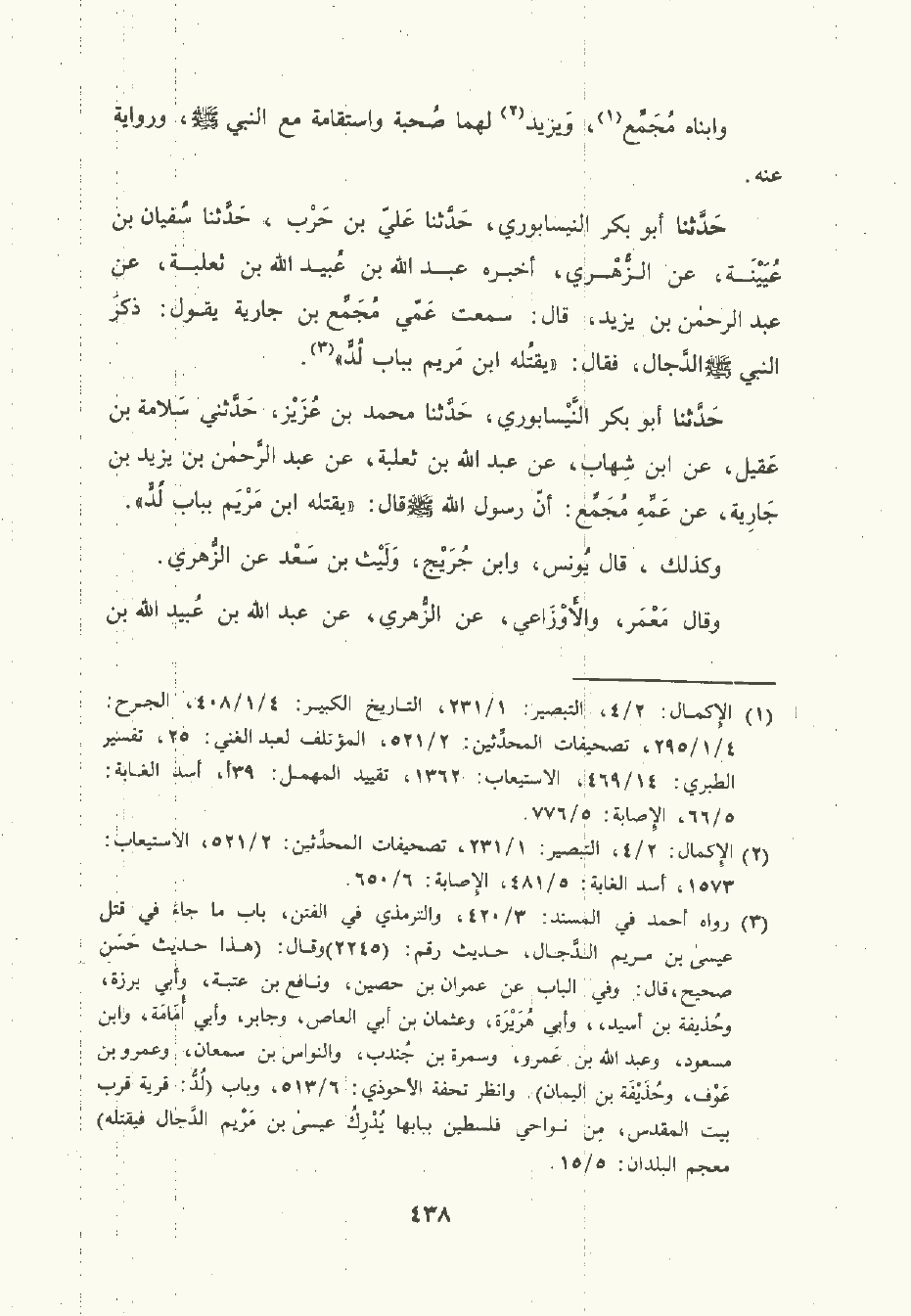 حَدَّثَنا أبو بَكْر النَّيْسَابوري , حَدَّثَنا علي بن حَرْب , حَدَّثَنا سُفْيان بن عُيَيْنة , عن الزُّهْري أخبره عَبد الله بن عُبَيد الله بن ثَعْلَبة , عن عَبد الرَّحْمن بن يَزِيد قال: سَمِعتُ عمي مُجَمِّع بن جَارِية يقول: ذكر النَّبِيّ صلى الله عليه وسلم الدَّجَّال فقال: يقتله ابن مَرْيم بباب لُدٍّ.