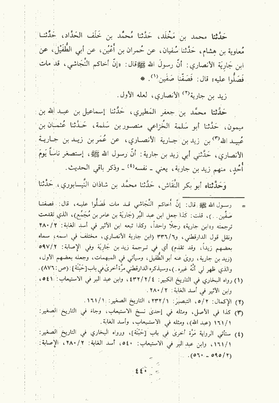 حَدَّثَنا مُحمَّد بن مَخْلَد، حَدَّثَنا مُحمَّد بن خَلَف الحَدَّاد , حَدَّثَنا مُعَاوية بن هشام , حَدَّثَنا سُفْيان , عن حُمْرَان بن أَعْيُن , عَن أبي الطُّفَيْل , عن ابن جَارِيَة الأَنْصَاري: أن رسول الله صلى الله عليه وسلم قال: إن أخاكم النَّجَاشِيّ قد مات فصلوا عليه قال: فصفنا صفين.