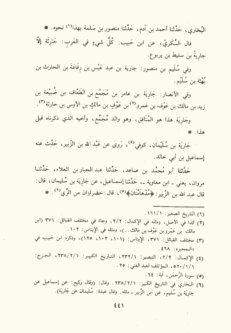 حَدَّثَنا أبو مُحمَّد بن صَاعِد , حَدَّثَنا عَبد الجَبَّار بن العَلاء , حَدَّثَنا مروان يعني – ابن مُعَاوية – حَدَّثَنا إسماعيل , عن جَارِيَة بن سُلَيمان قال: قال عَبد الله بن الزُّبَيْر {مُدْهَامَّتَان} قال: خضراوان من الرِّيّ.