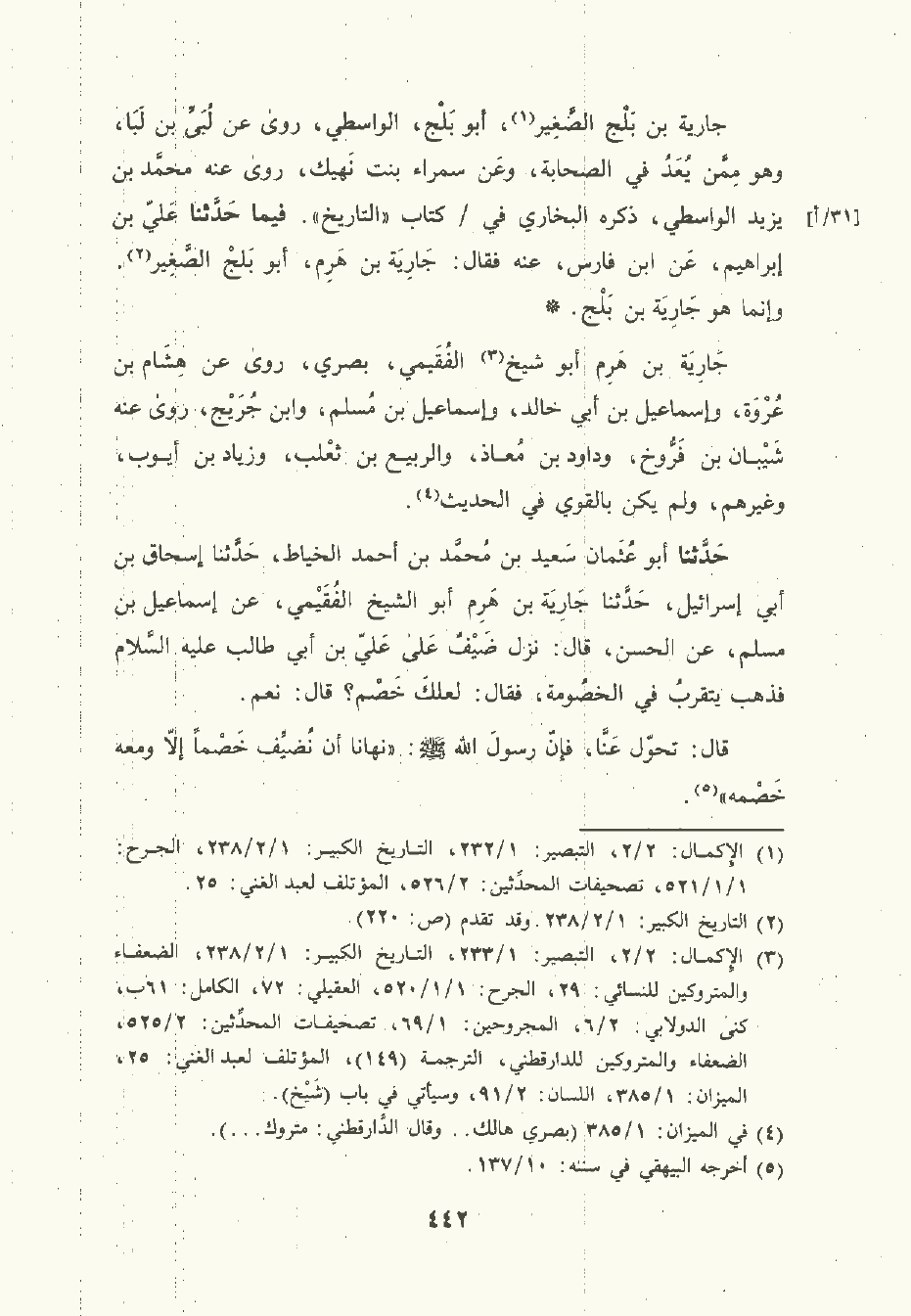 حَدَّثَنا أبو عُثْمان سَعِيد بن مُحمَّد بن أحمد الخياط , حَدَّثَنا إسحاق بن أبي إسرائيل , حَدَّثَنا جَارِيَة بن هَرِم أبو الشَّيْخ الفُقَيْمِيّ , عن إسماعيل بن مسلم , عن الحسن قال: نزل ضيف على علي بن أبي طالب عليه السَّلام فذهب يتقرب في الخصومة فقال: لعلك خصم؟ قال: نعم , قال: تحول عنا فإن رسول الله صلى الله عليه وسلم نهانا أن نضيف خصما إلا ومعه خصمه.