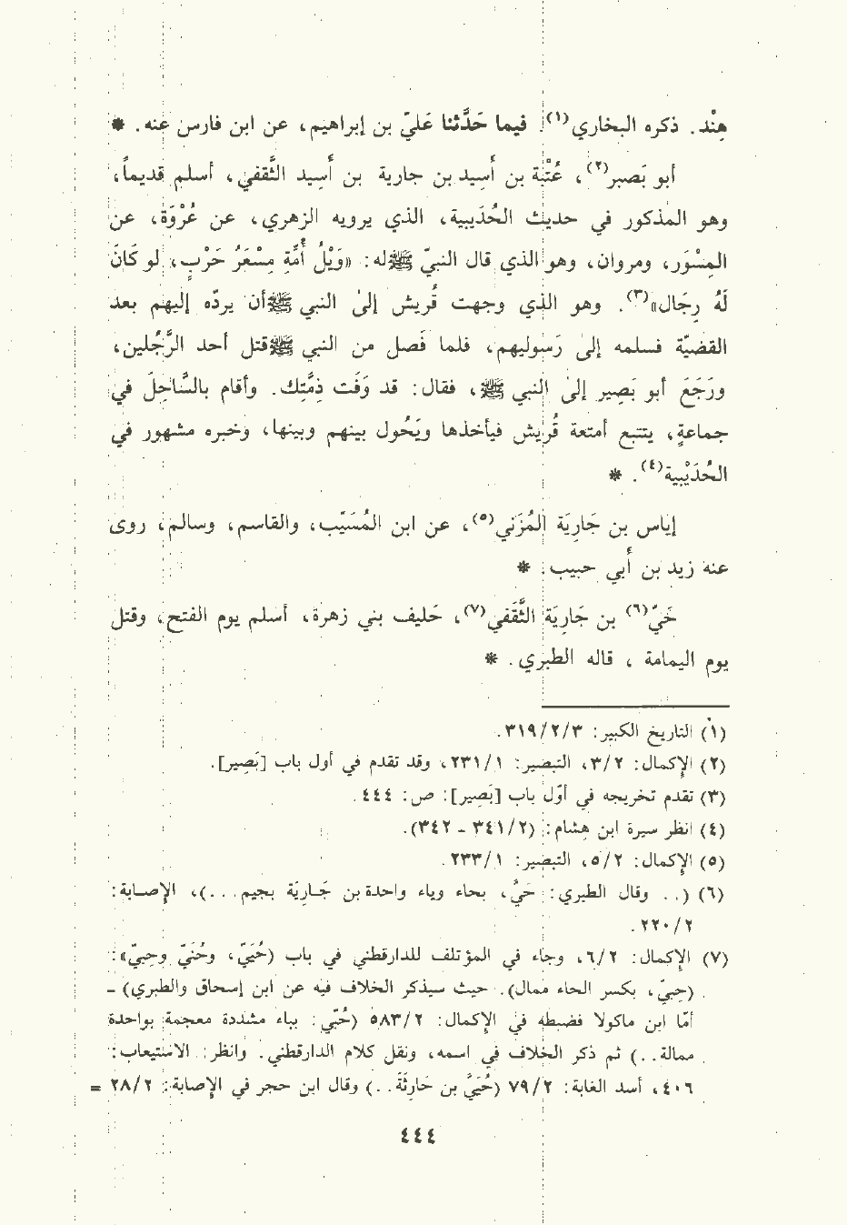 أبو بَصِير عُتْبَة بن أَسِيد بن جَارِيَة بن أَسِيد الثَّقَفِي أسلم قديما وهو المذكور في حديث الحُدَيْبية الَّذي يرويه الزُّهْري , عن عُرْوة , عن المسور ومروان وهو الَّذي قال النَّبِيّ صلى الله عليه وسلم له: ويل أمه مِسْعَر حَرْب لو كان له رجال. وهو الَّذي وجهت قُرَيْش إلى النَّبِيّ صلى الله عليه وسلم أن يرده إليهم بعد القضية فسلمه إلى رسوليهم فلما فصل من النَّبِيّ صلى الله عليه وسلم قتل أحد الرجلين ورجع أبو بصير إلى النَّبِيّ صلى الله عليه وسلم فقال: قد وفت ذمتك. وأقام بالساحل في جماعة يتتبع أمتعة قُرَيْش فيأخذها ويحول بينهم وبينها وخبره مشهور في الحُدَيْبية.