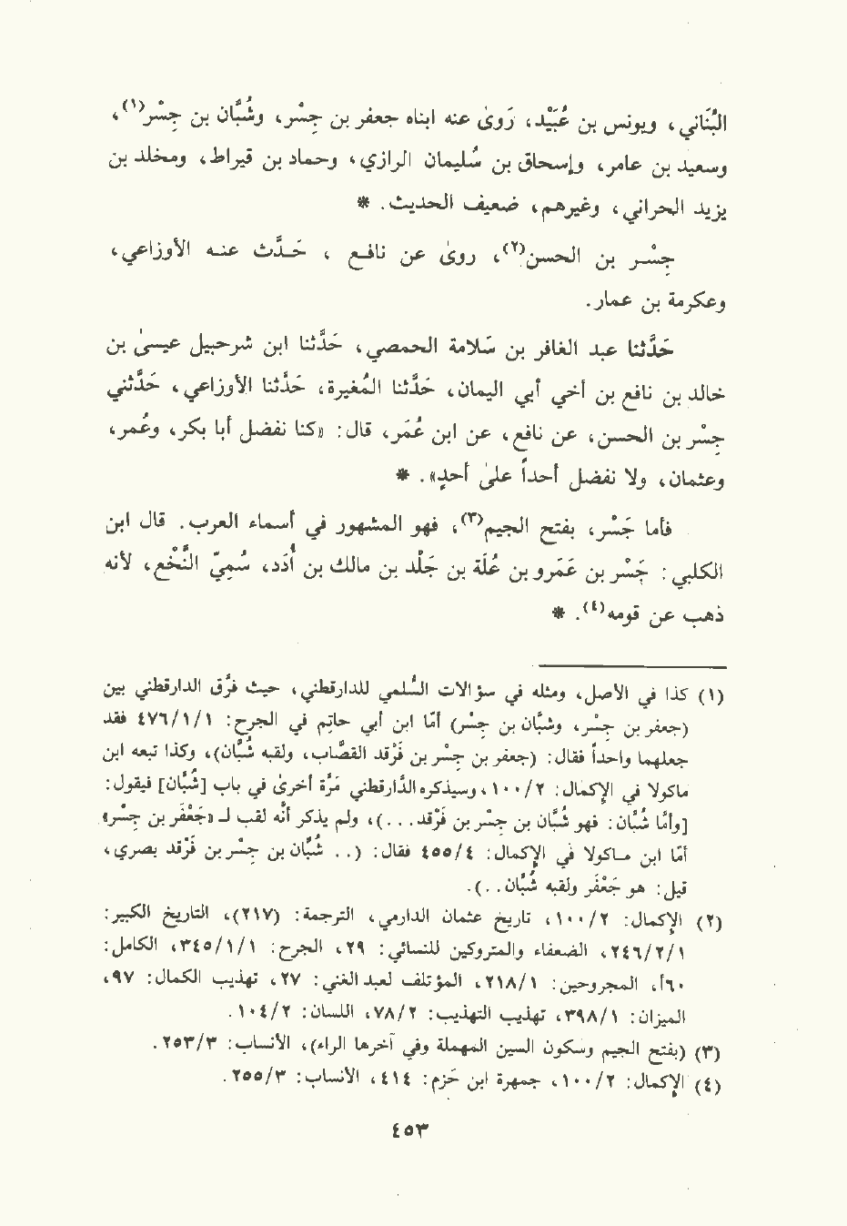 حَدَّثَنا عبد الغافر بن سَلامة الحِمْصِيّ , حَدَّثَنا ابن شُرَحْبِيل عيسى بن خالد بن نافع بن أخي أبي اليمان , حَدَّثَنا المُغِيرَة , حَدَّثَنا الأَوْزَاعي حَدَّثني جسر بن الحسن , عن نافع , عن ابن عُمَر قال: كنا نفضل أبا بَكْر وعُمر وعُثمان ولا نفضل أحدا على أحد.
