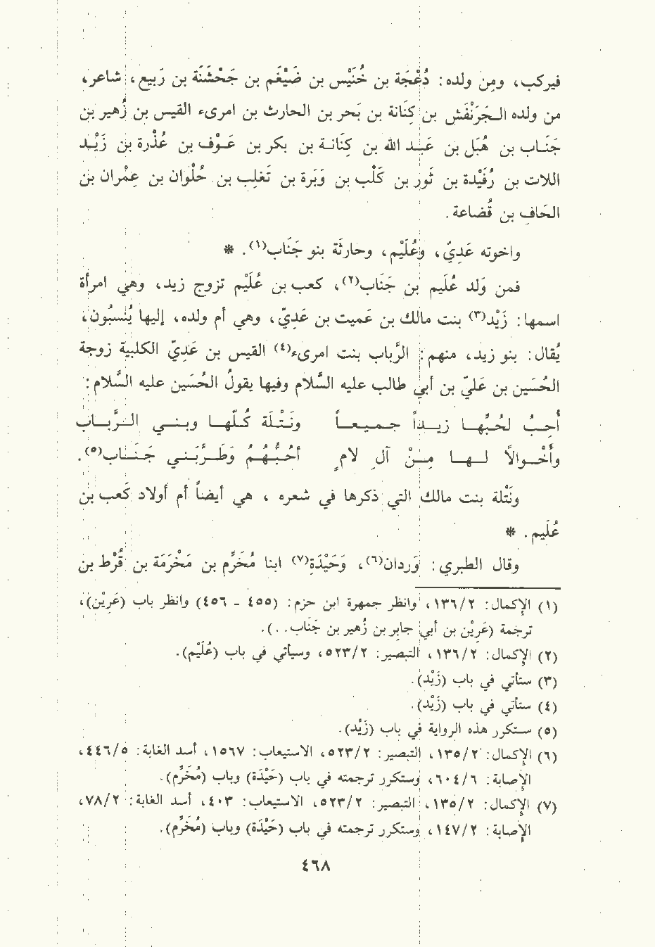 فمن وَلد عُلَيْم بن جَنَاب كَعْب بن عُلَيْم تزوج زيد وهي امرأة اسمها: زَيْد بنت مالك بن عَميت بن عَدِيّ وهي أم ولد إليها ينسبون , يُقال: بنو زيد، منهم: الرَّباب بنت امرىء القَيْس بن عَدِيّ الْكَلْبِيَّة زوجة الحُسَين بن علي بن أبي طالب عليه السَّلام وفيها يقول الحُسَين عليه السَّلام: