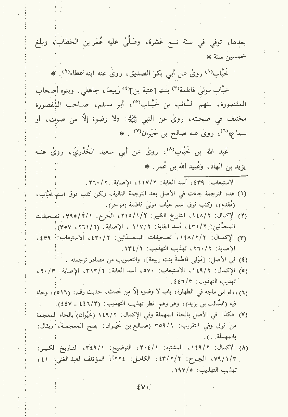 خَبَّاب مولى بنت عُتْبَة بن رَبِيعَة جاهلي وبنوه أصحاب المقصورة منهم السَّائِب بن خَبَّاب أبو مسلم صاحب المقصور مختلف في صحبته رَوَى عن النَّبِيّ صلى الله عليه وسلم: لا وضوء إلا من صوت أو سماع، رَوَى عنه صالح بن حَيْوان.