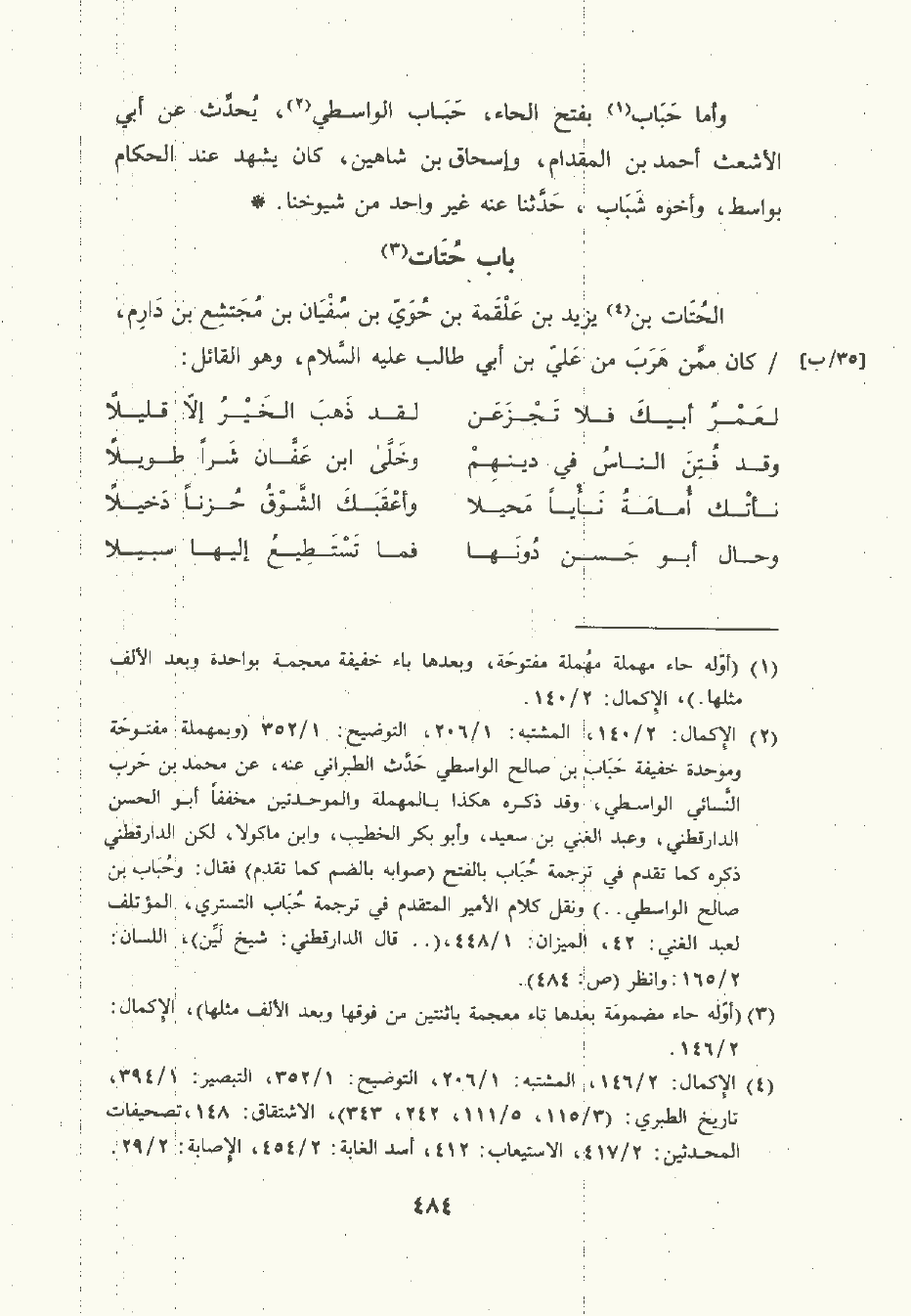 وأمَّا حَبَاب بفتح الحاء حَبَاب الوَاسِطيّ يُحَدِّث عَن أبي الأَشْعَث أحمد بن المقدام وإسحاق بن شاهين كان يشهد عند الحكام بواسط وأخوه شَبَاب , حَدَّثَنا عنه غير واحد من شيوخنا.