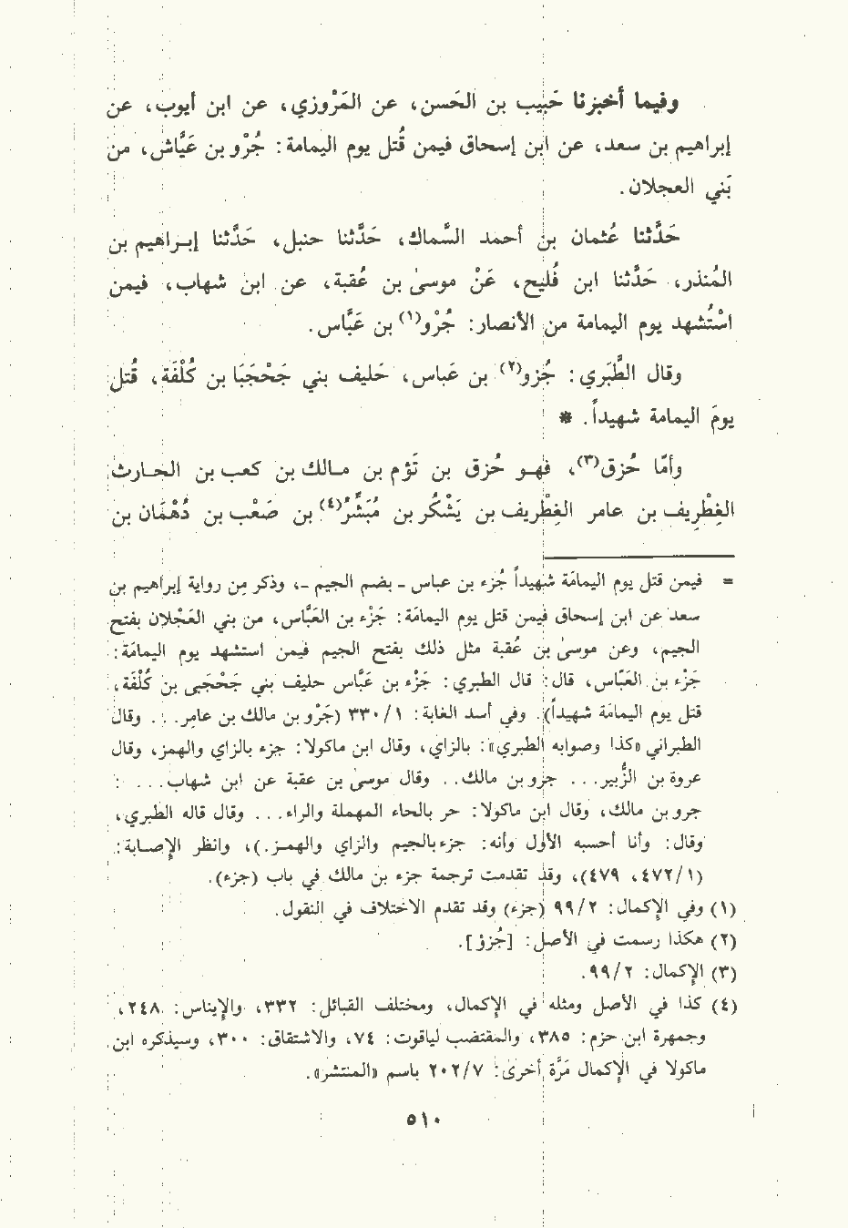 وفيما أخبرنا حبيب بن الحسن , عن المَرْوَزِيُّ , عن ابن أَيُّوب , عن إبراهيم بن سَعْد , عن ابن إسحاق فيمن قتل يوم اليمامة: جُرْو بن عَيَّاش من بني العجلان.