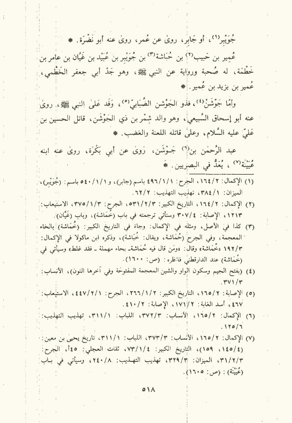 وَأَمَّا جَوْشَنْ , فذو الجَوْشَن الضَّبَابيّ , وَفَد عَلى النَّبِيّ صلى الله عليه وسلم، رَوَى عنه أبو إسحاق السَّبِيعي وهو والد شِمْر بن ذي الجَوْشَن , قاتل الحُسَين بن عَليّ عليه السَّلام , وعلى قاتله اللعنة والغضب.