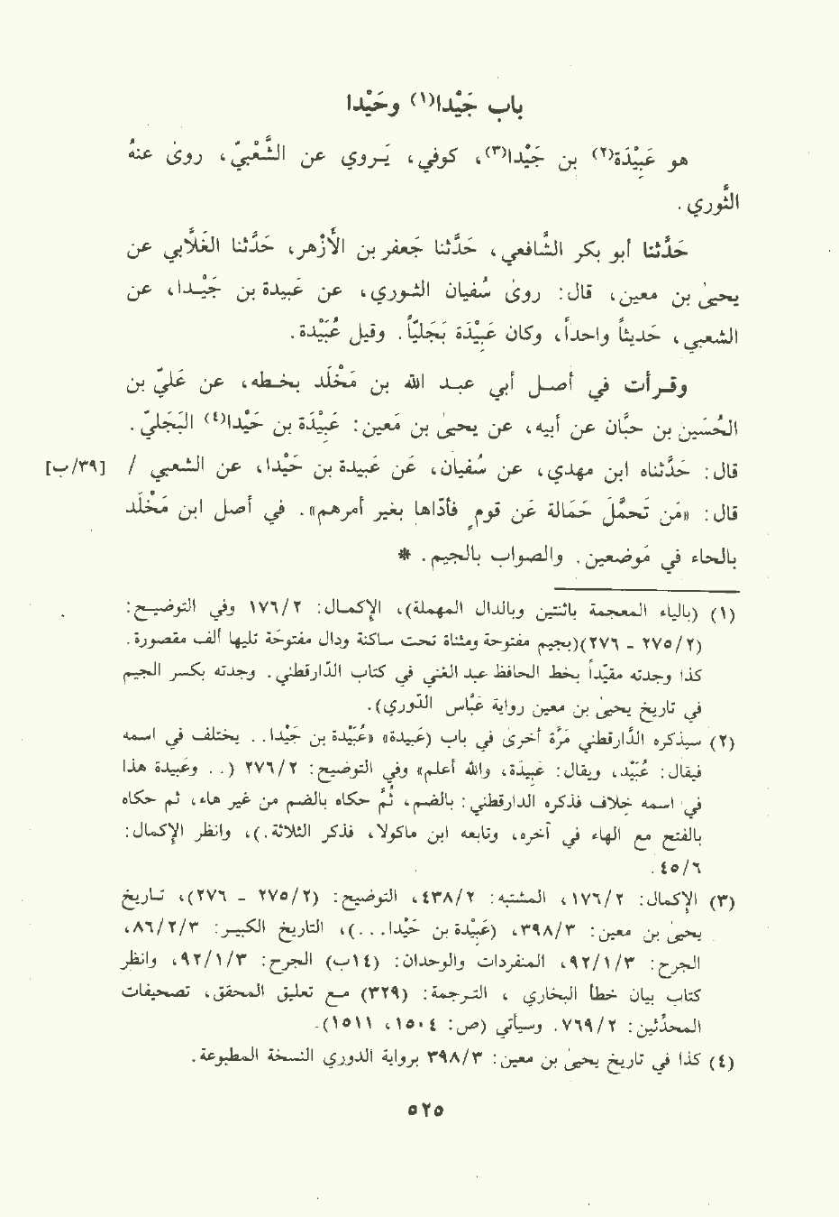 وقرأت في أصل أبي عَبد الله بن مَخْلَد بخطه , عن عَليّ بن الحُسَين بن حبَّان , عَن أبيه , عن يَحْيى بن مَعِين: عَبِيدَة بن حَيْدا البَجَلِيّ. قال: حدثناه ابن مَهْديّ , عن سُفْيان , عَن عَبِيدة بن حَيْدا , عن الشَّعْبي قال: مَن تَحمَّلَ حَمَالة عَن قومٍ فأدّاها بغير أمرهم. في أصل ابن مَخْلَد بالحاء في مَوضعين. والصواب بالجيم.