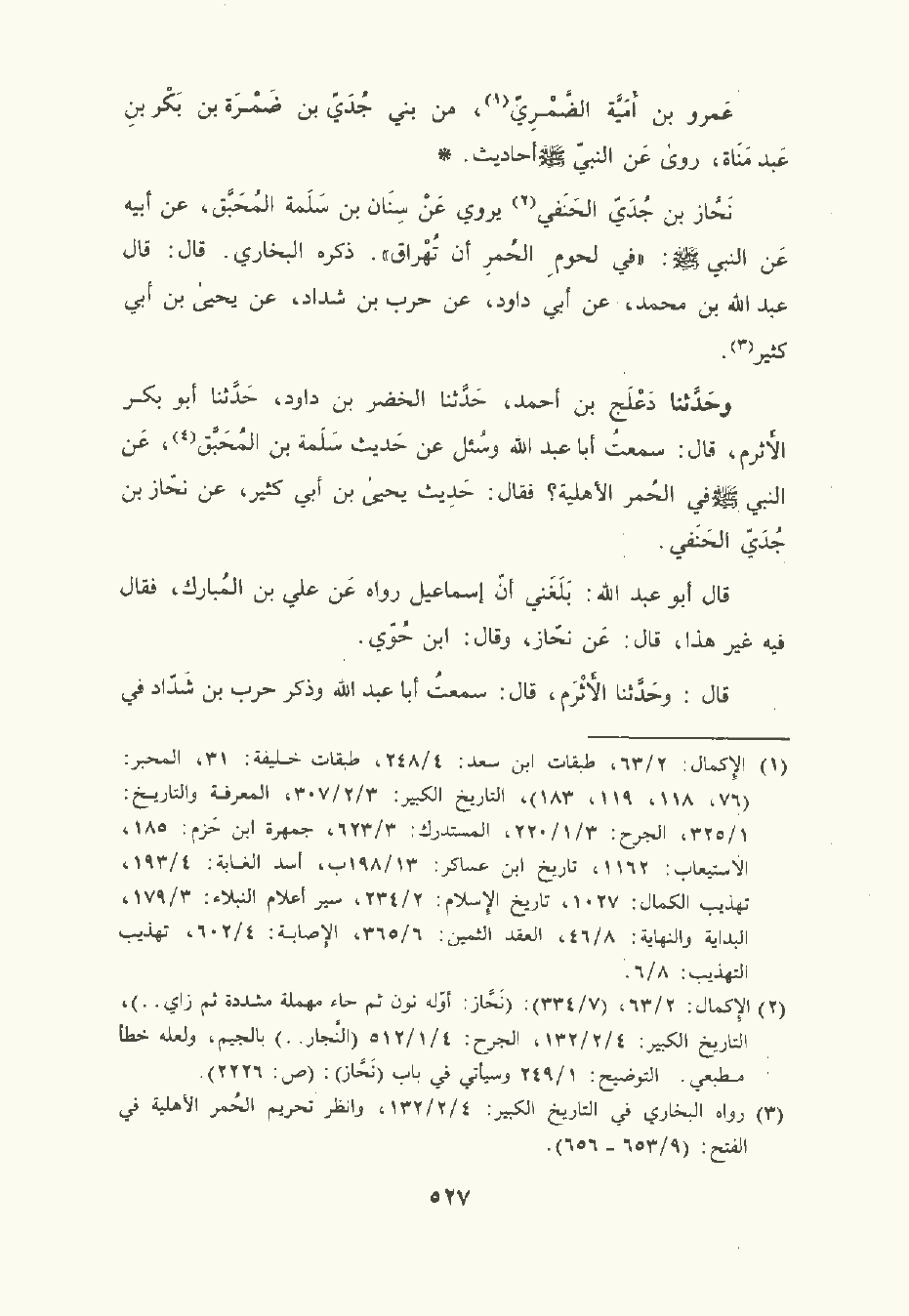 نَحَّاز بن جُدَيّ الحَنَفِي يَرْوِي عَنْ سِنَان بن سَلَمة المُحَبَّق , عَن أبيه , عَن النَّبِيّ صلى الله عليه وسلم: في لحومِ الحُمرِ أن تُهْراق. ذكره البُخَاري. قال: قال عَبد الله بن مُحمَّد , عَن أبي داود , عن حَرْب بن شداد , عن يَحْيى بن أبي كثير.