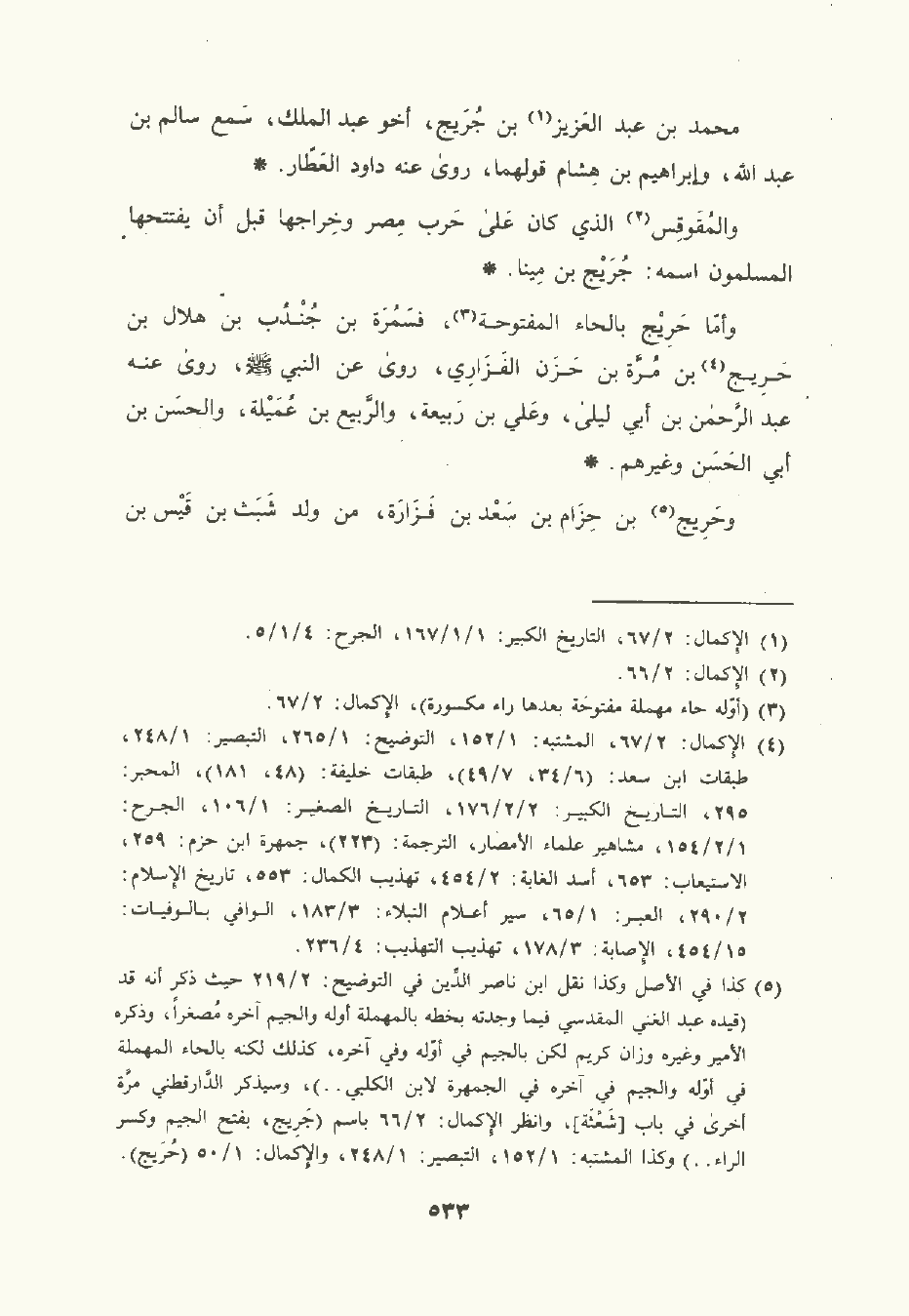 وأمَّا حَرِيج بالحاء المفتوحة فسَمُرَة بن جُنْدُب بن هِلاَل بن حَرِيج بن مُرَّة بن حَزْن الفَزَاري رَوَى عن النَّبِيّ صلى الله عليه وسلم، رَوَى عنه عبد الرَّحْمن بن أبي ليلى وعَليّ بن رَبِيعَة والرَّبيع بن عُمَيْلة والحسن بن أبي الحسن وغيرهم.