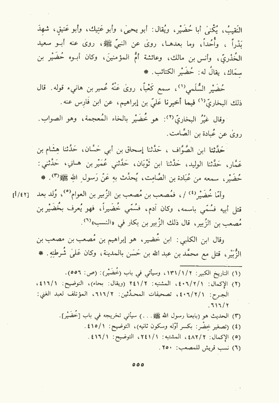 وقال ابنُ الكَلْبي: ابن خُضَيْر هو إبراهيم بن مصعب بن مصعب بن الزُّبَيْر , قتل مع مُحمَّد بن عَبد الله بن حسن بالمدينة , وكان على شُرطِتِه.