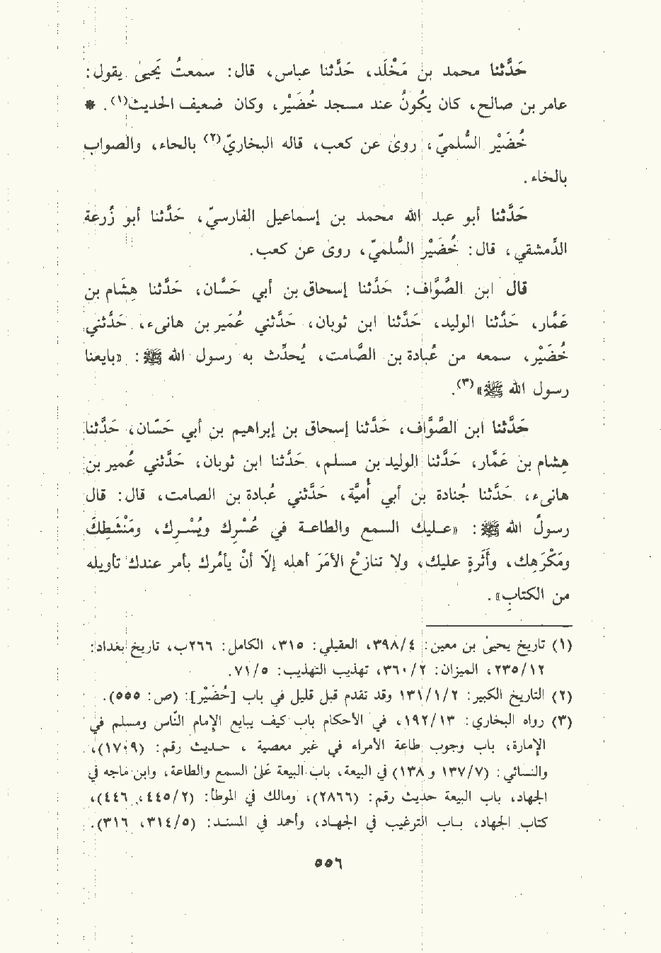 قال ابن الصَّوَّاف , حَدَّثَنا إِسْحَاق بن أبي حسان , حَدَّثَنا هِشَام بن عَمَّار , حَدَّثَنا الوليد , حَدَّثَنا ابن ثوبان حَدَّثني عُمَير بن هانىء , حَدَّثني خضير سمعه من عُبَادة بن الصَّامت , يحدث به رسول الله صلى الله عليه وسلم: بايعنا رسول الله صلى الله عليه وسلم.