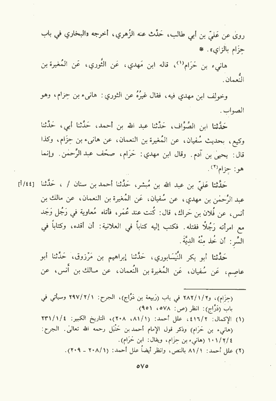 حَدَّثَنا ابن الصَّوَّاف , حَدَّثَنا عَبد الله بن أحمد , حَدَّثَنا أبي , حَدَّثَنا وكيع بحديث سفيان , عن المُغِيرَة بن النُّعْمان , عن هانىء بن حزام وكذا قال: يَحْيى بن آدم. وقال ابن مَهْديّ: حَرَام , صحف عبد الرَّحْمن , وإنما هو: حِزَام.