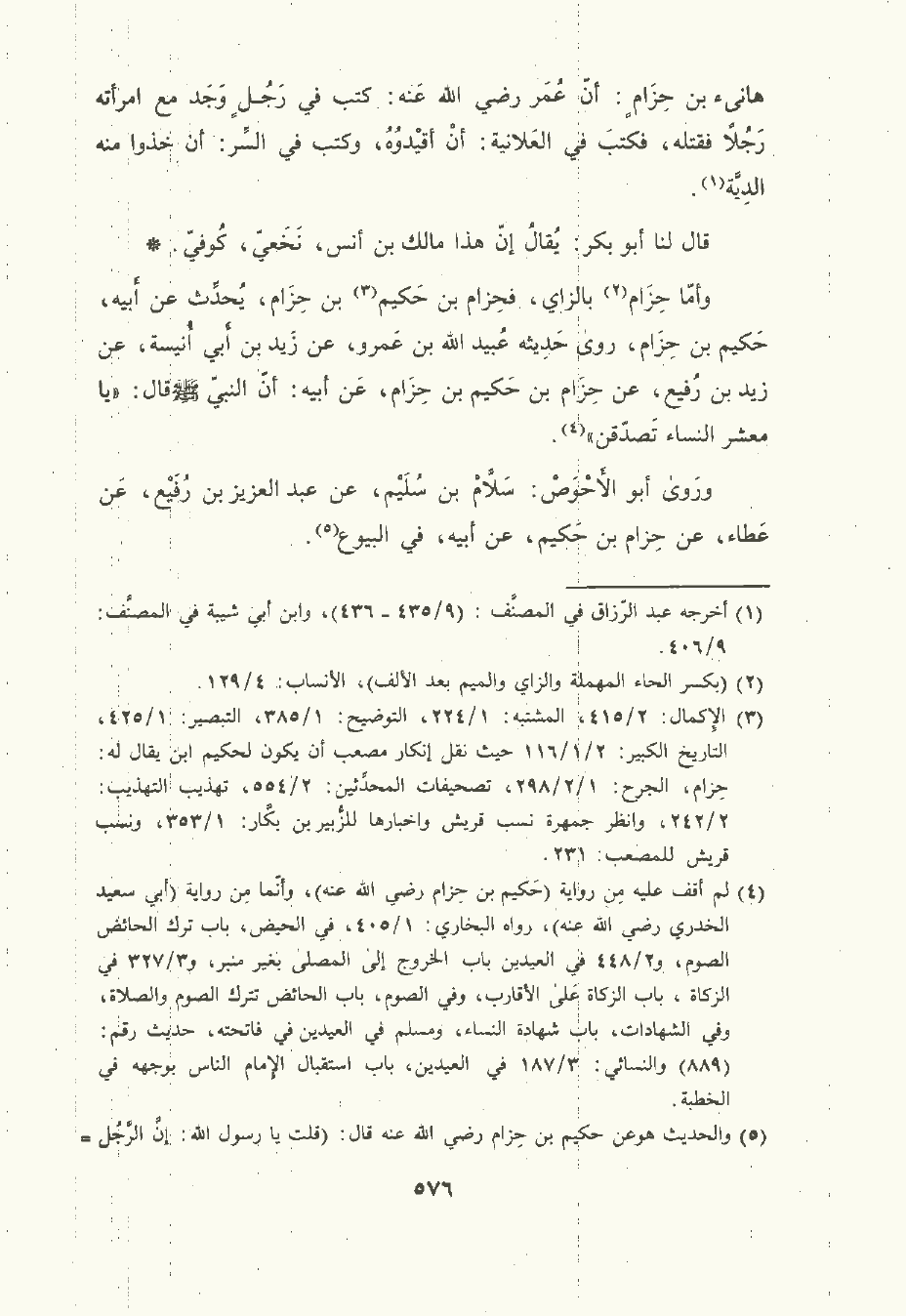 وأمَّا حِزَام بالزاي , فَحِزَام بن حَكِيم بن حِزَام , يحدث عن أبيه حَكِيم بن حِزَام , روى حديثه عُبَيْد الله بن عَمْرو , عن زيد بن أبي أُنَيْسَة , عن زيد بن رُفَيْع , عن حِزَام بن حَكِيم بن حِزَام , عن أبيه: أنَّ النَّبِيَّ صلى الله عليه وسلم قال: يا معشر النساء تصدقن.