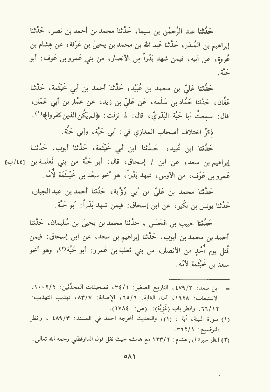 حَدَّثَنا حبيب بن الحسن , حَدَّثَنا مُحمَّد بن يَحْيى بن سُلَيْمان , حَدَّثَنا أحمد بن مُحمَّد بن أَيُّوب , حَدَّثَنا إبراهيم بن سَعْد، عن ابن إِسْحَاق: فيمن قتل يوم أحد من الأَنْصَار من بني ثعلبة بن عَمْرو: أبو حَبَّة , وهو أخو سعد بن خَيْثَمة لأُمِّه.