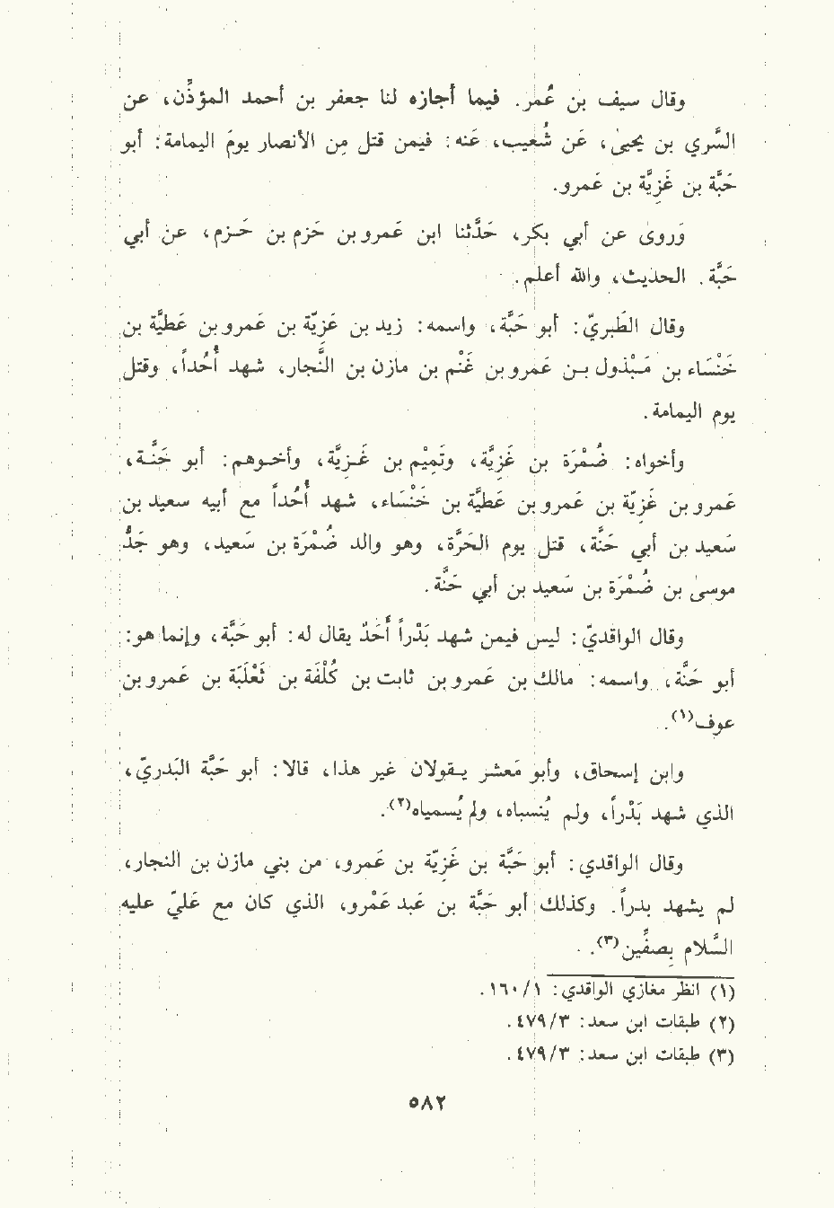 وقال سيف بن عُمَر. فيما أجازه لنا جَعْفر بن أحمد المؤذن , عن السَّرِيّ بن يَحْيَى , عن شُعَيْب عنه: فيمن قتل من الأَنْصَار يوم اليمامة: أبو حَبَّة بن غزية بن عَمْرو.