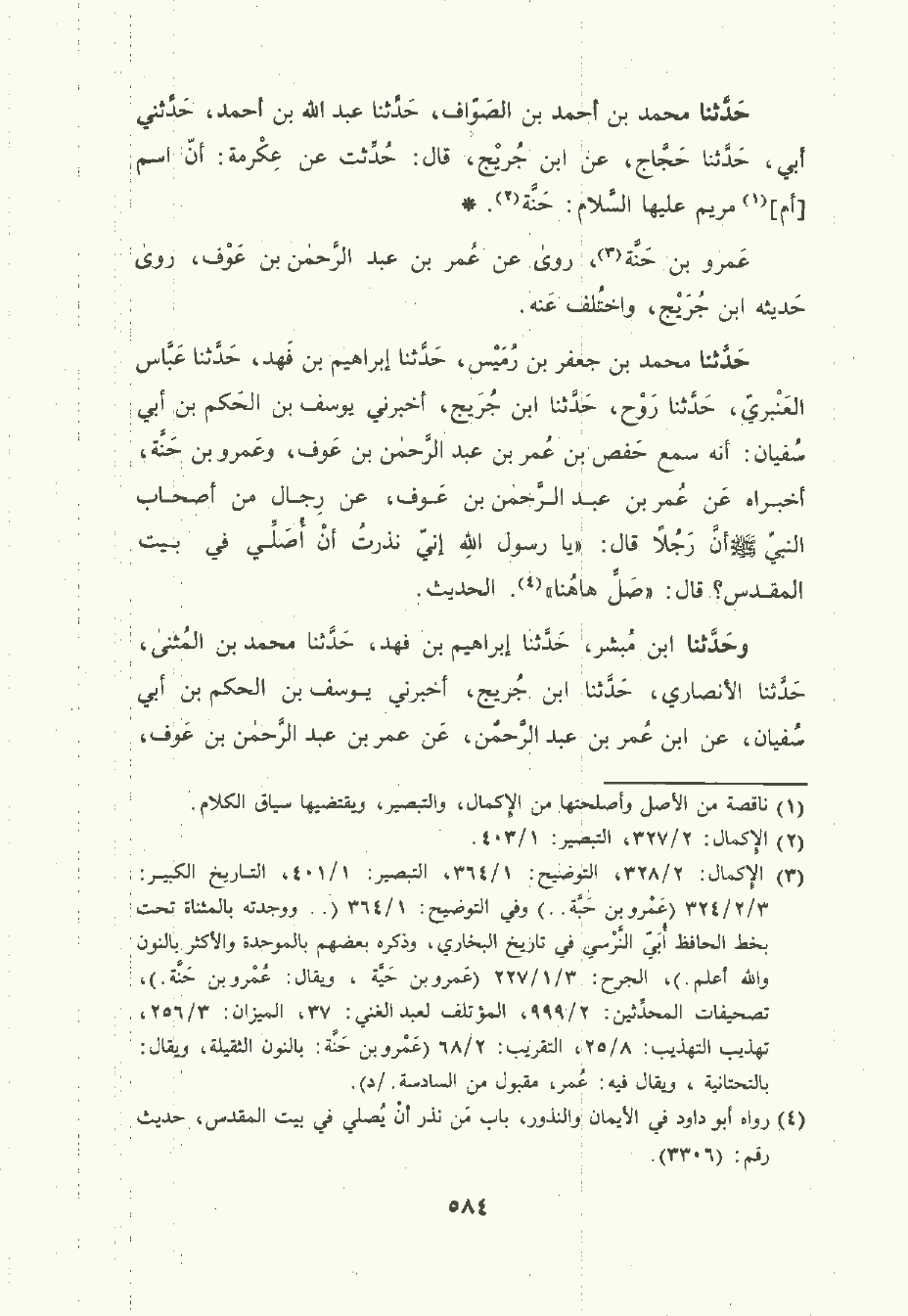 حَدَّثَنا مُحمَّد بن أحمد بن الصَّوَّاف , حَدَّثَنا عَبد الله بن أحمد , حَدَّثني أبي , حَدَّثَنا الحجاج، عن ابن جُرَيْج قال: حُدِّثْت عن عكرمة: أن اسم أم مريم عليها السَّلام: حَنَّة.