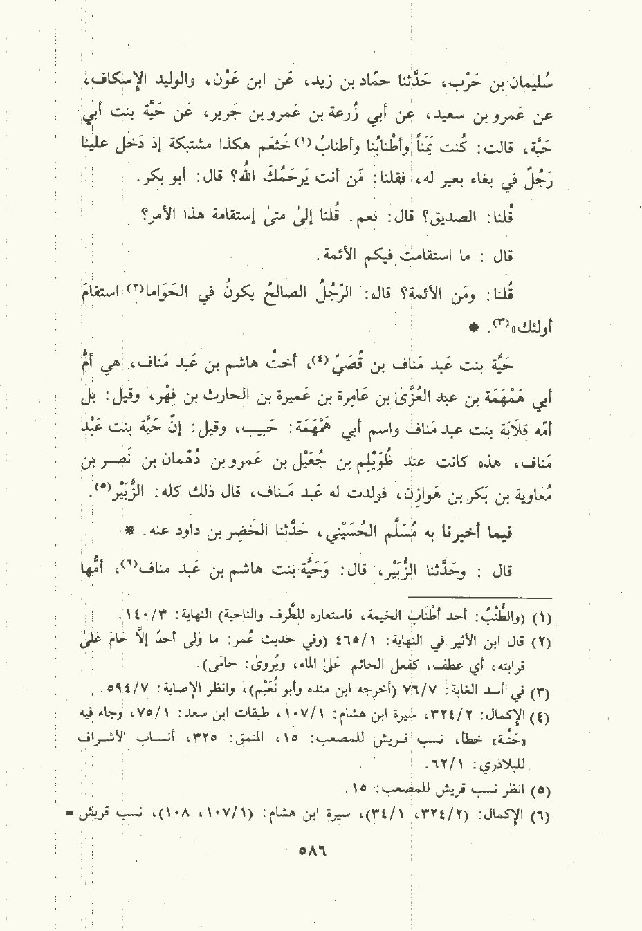 قال: وحدثنا الزُّبَيْر قال: وحَيَّة بنت هاشم بن عَبْد مَنَاف , أُمُّها جحد , وتٌكْنَى أُمُّ عدي بنت حُبَيب بن الحارث بن مالك بن حُطَيْط الثَّقَفيّ وتزوجها الأحجم بن دِنْدِنة بن عَمْرو الخُزَاعِيّ فولدت له أسيد وإخوته.