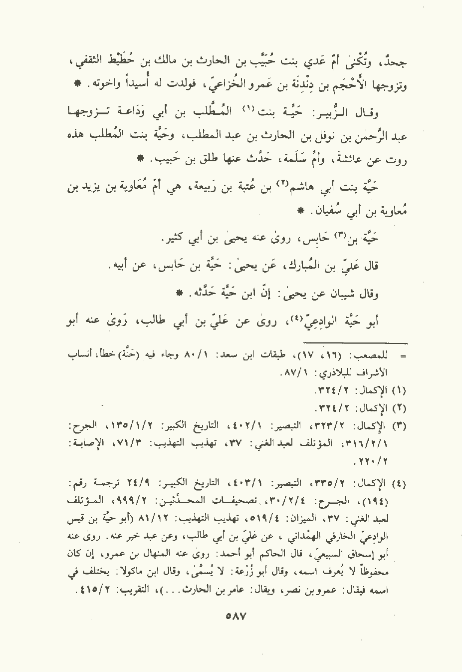 وقال الزُّبَيْر: حَيَّة بنت المطلب بن أبي وداعة تزوجها عبد الرَّحْمن بن نوفل بن الحارث بن عبد المطلب وحية بنت المطلب هذه رَوَت عن عائشة , وأم سَلَمة , حَدَّث عَنْها طَلْق بن حَبِيب.