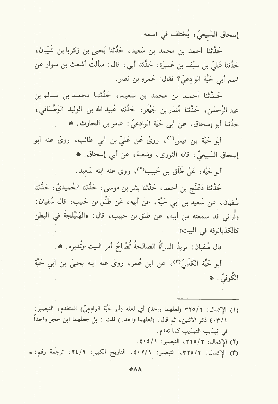 حَدَّثَنا أحمد بن مُحمَّد بن سَعِيد , حَدَّثَنا يَحْيى بن زكريا بن شيبان , حَدَّثَنا علي بن سيف بن عميرة , حَدَّثَنا أبي قال: سألت أشعث بن سوار عن اسم أبي حَيَّة الوَادِعيّ؟ فقال: عَمْرو بن نصر.