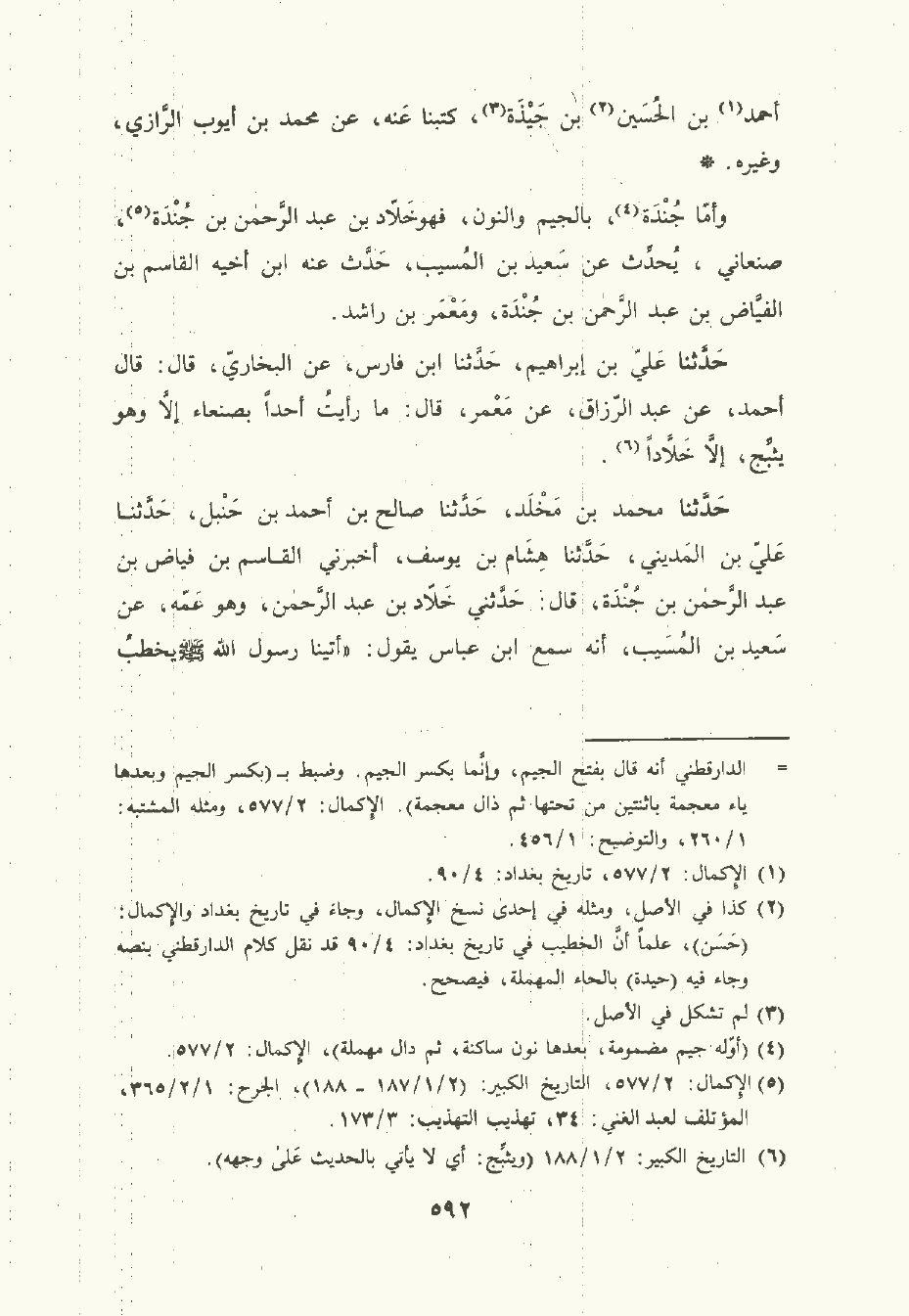 وأمَّا جُنْدَة بالجيم والنون , فهو خَلاَّد بن عبد الرَّحْمن بن جُنْدَة , صَنْعَانيّ , يحدث عن سعيد بن المُسَيَّب , حَدَّث عنه ابن أخيه القاسم بن الفياض بن عبد الرَّحْمن بن جُنْدَة ومعمر بن راشد.