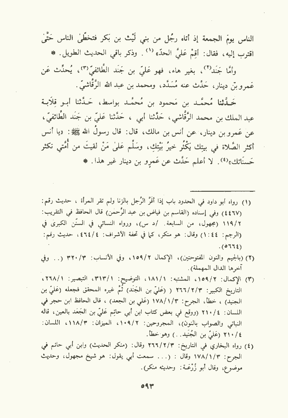 حَدَّثَنا مُحمَّد بن محمود بن مُحمَّد بواسط , حَدَّثَنا أبو قِلاَبَة عبد الملك بن مُحمَّد الرَّقَّاشِيّ , حَدَّثَنا أبي , حَدَّثَنا علي بن جَنَد الطائفي , عن عَمْرو بن دِينَار , عن أَنَس بن مَالِك قال: قال رسول الله صلى الله عليه وسلم: يا أنس أكثر الصَّلاَة في بيتك يكثر خير بيتك , وسلم على من لقيت من أمتي تكثر حسناتك. لا أعلم حدث عن عَمْرو بن دِينَار غير هذا.