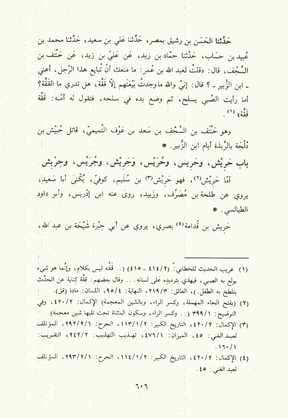 حَدَّثَنا الحَسَن بن رشيق بمصر , حَدَّثَنا علي بن سَعْد , حَدَّثَنا مُحمَّد بن عبيد بن حساب , حَدَّثَنا حماد بن زيد , عن علي بن زيد , عن حَنْتَف بن السِّجْف قال: قلت لعَبد الله بن عُمَر: ما منعك أن تبايع هذا الرجل أعني – ابن الزُّبَيْر - قال: إني والله ما وجدت بيعتهم إلا قَقَّة، هل تدري ما الققة؟ أما رأيت الصبي يسلح , ثم وضع يده في سلحه فتقول له أمه: ققة ققة.