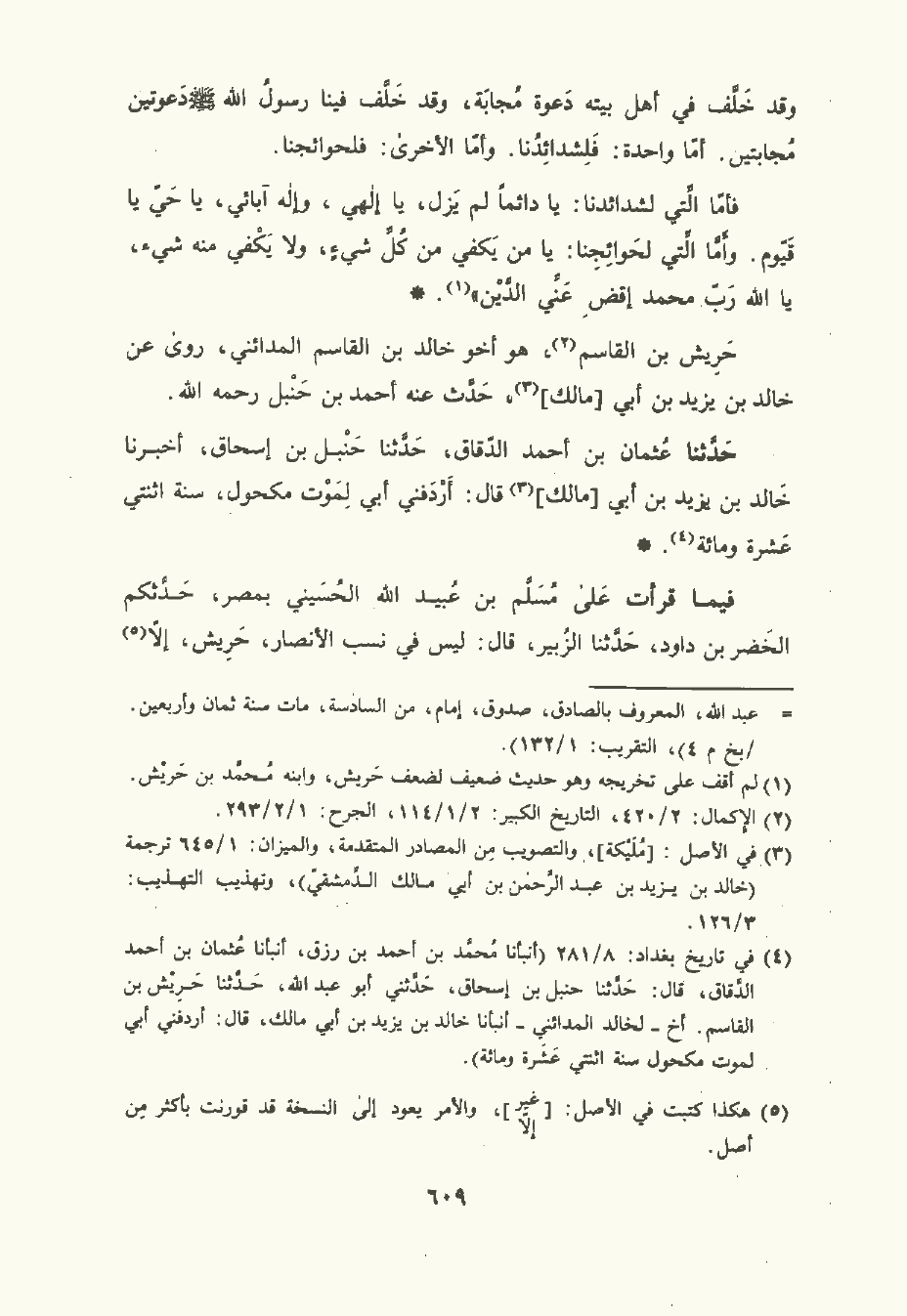 فيما قرأت على مسلم بن عبيد الله الحسيني بمصر , حدثكم الخضر بن داود , حَدَّثَنا الزُّبَيْر قال: ليس في نسب الأَنْصَار حَرِيش إلا الحَرِيش بن جحْجَبَا والحَرِيش هذا جد أَنَس بن مَالِك وما سوى ذلك , فهو: الحريس بالسين.
