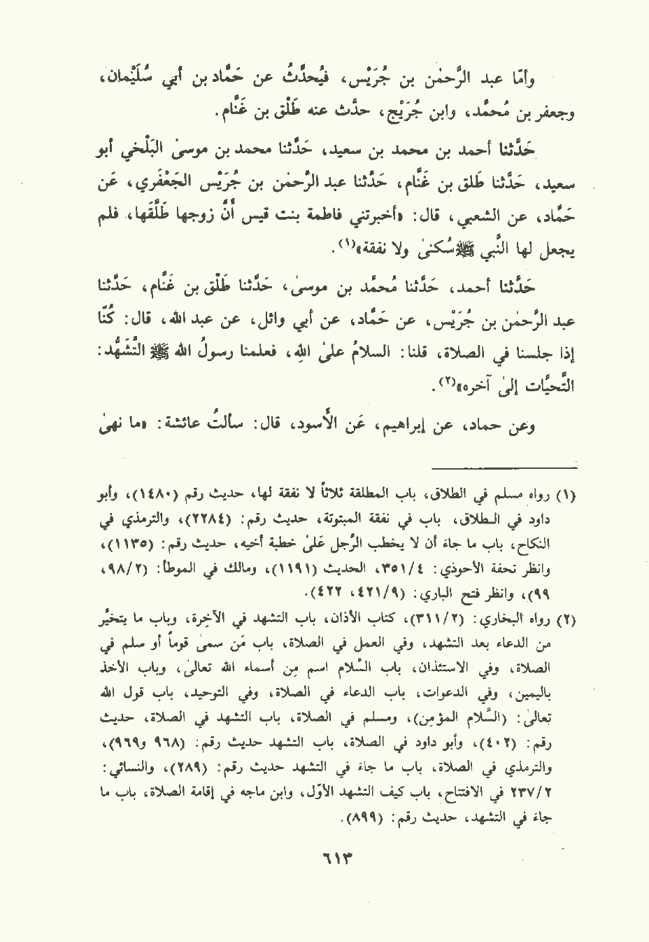 حَدَّثَنا أحمد بن مُحمَّد بن سَعِيد , حَدَّثَنا مُحمَّد بن موسى البلخي أبو سَعِيد , حَدَّثَنا طلق بن غنام , حَدَّثَنا عبد الرَّحْمن بن جُرَيْس الجعفري , عن حماد , عن الشَّعْبيّ قال: أخبرتني فاطمة بنت قيس أن زوجها طلقها فلم يجعل لها النَّبِيّ صلى الله عليه وسلم سكنى ولا نفقة.