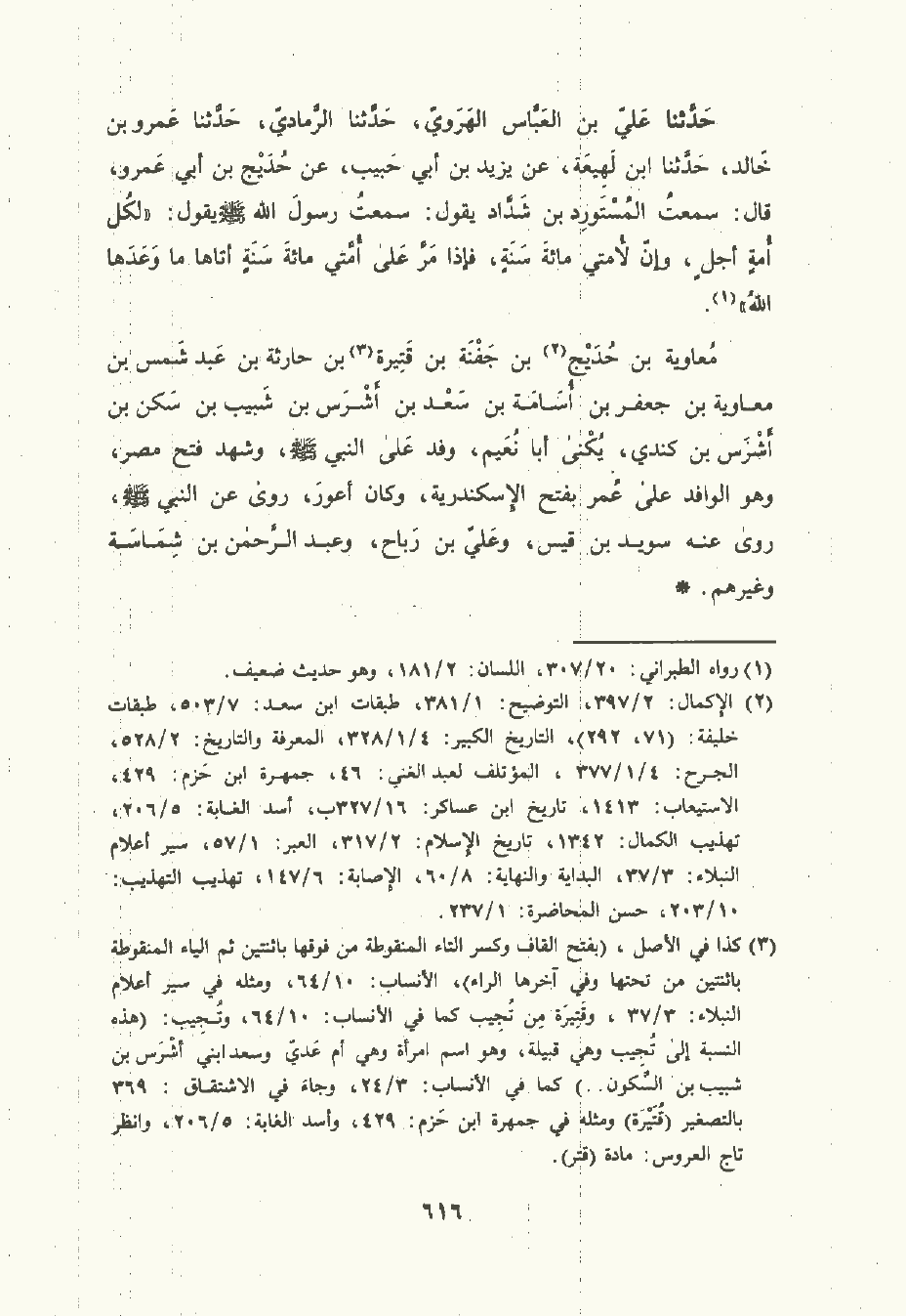 حَدَّثَنا علي بن العَبَّاس الهَرَويّ , حَدَّثَنا الرَّماديّ , حَدَّثَنا عَمْرو بن خالد , حَدَّثَنا ابن لهيعة , عن يزيد بن أبي حبيب , عن حُدَيْج بن أبي عَمْرو قال: سَمِعتُ المُسْتَورِد بن شَدَّاد يقول: سمعت رسول الله صلى الله عليه وسلم يقول: لكل أمة أجل وإن لأمتي مِئَة سنة فإذا مر على أمتي مِئَة سنة أتاها ما وعدها الله.