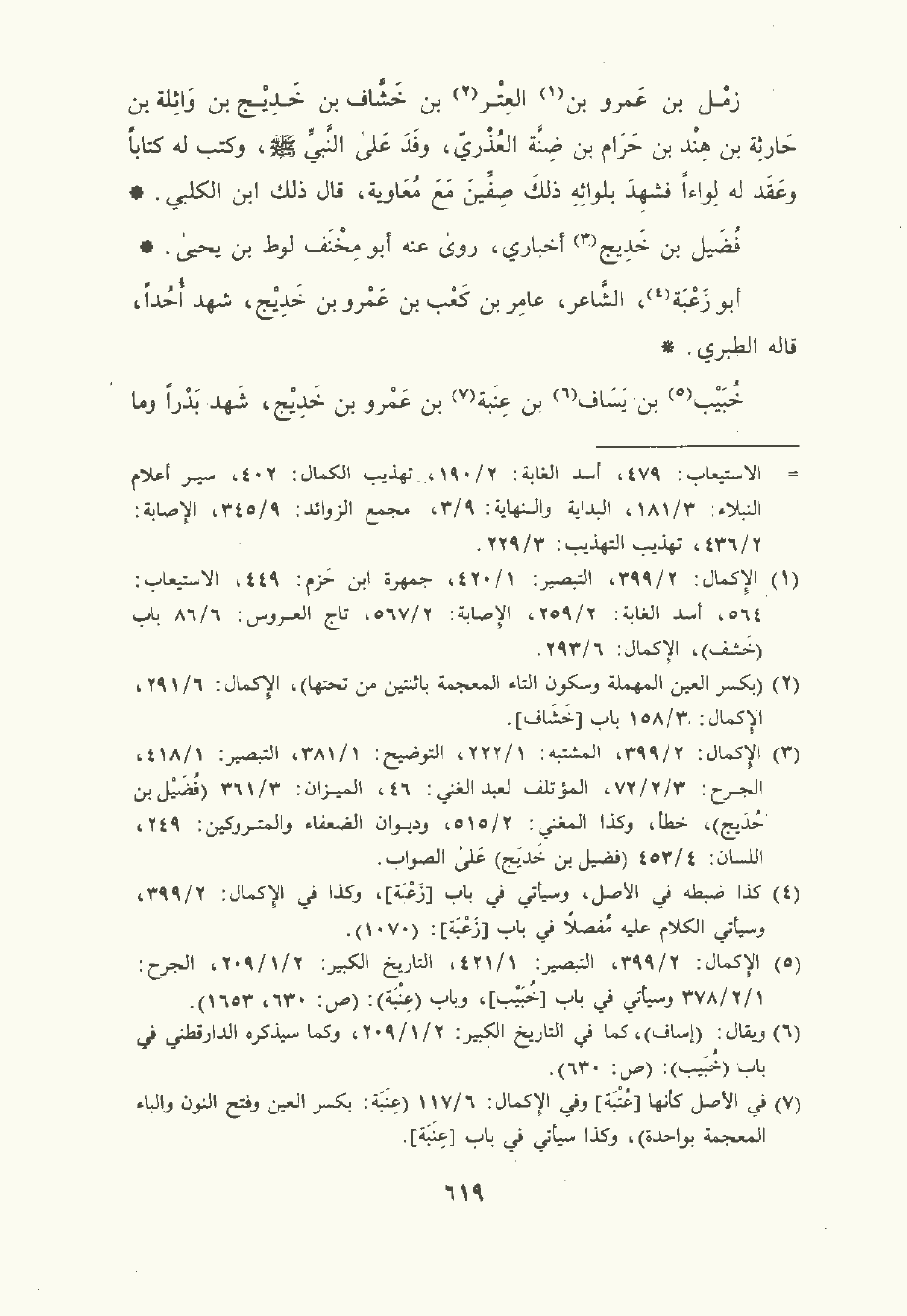 زمل بن عَمْرو بن العتر بن خشاف بن خديج بن واثلة بن حارثة بن هند بن حرام بن ضنة العذري وفد على النَّبِيّ صلى الله عليه وسلم وكتب له كتابا وعقد له لواءا فشهد بلوائه ذلك صفين مع مُعَاوية قال ذلك ابن الكَلْبيّ.