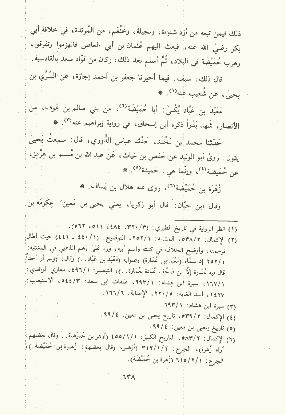 حَدَّثَنا مُحمَّد بن مَخْلَد , حَدَّثَنا عَبَّاس الدُّورِيّ قال: سَمِعتُ يَحْيى يقول: روى أبو الوليد , عن حفص بن غياث، عن عَبد الله بن مسلم بن هرمز , عن حُمَيْضَة وإنما هي: حَمِيدَة.
