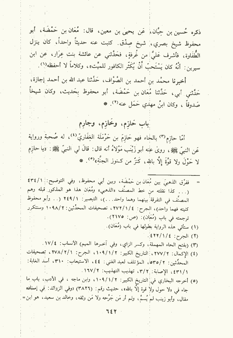 أمّا حازم بالحاء , فهو حَازِم بن حرملة الغِفَاريّ , له صُحْبة ورواية عن النَّبِيّ صلى الله عليه وسلم، رَوَى عنه أبو زينب مولاه أنه قال: قال لي النَّبِيّ صلى الله عليه وسلم: يا حَازِم لا حول ولا قوة إلا بالله كنز من كُنُوز الجَنَّة.