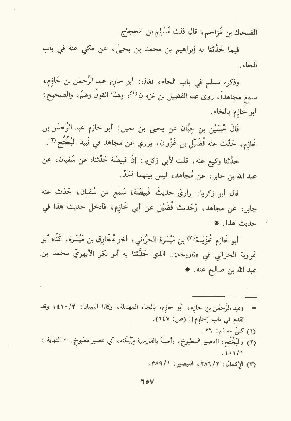 وذكره مسلم في باب الحاء فقال: أبو حَازِم عبد الرَّحْمن بن حَازِم سمع مجاهدا، رَوَى عنه الفضيل بن غزوان وهذا القول وهم والصحيح: أبو خَازِم بالخاء.
