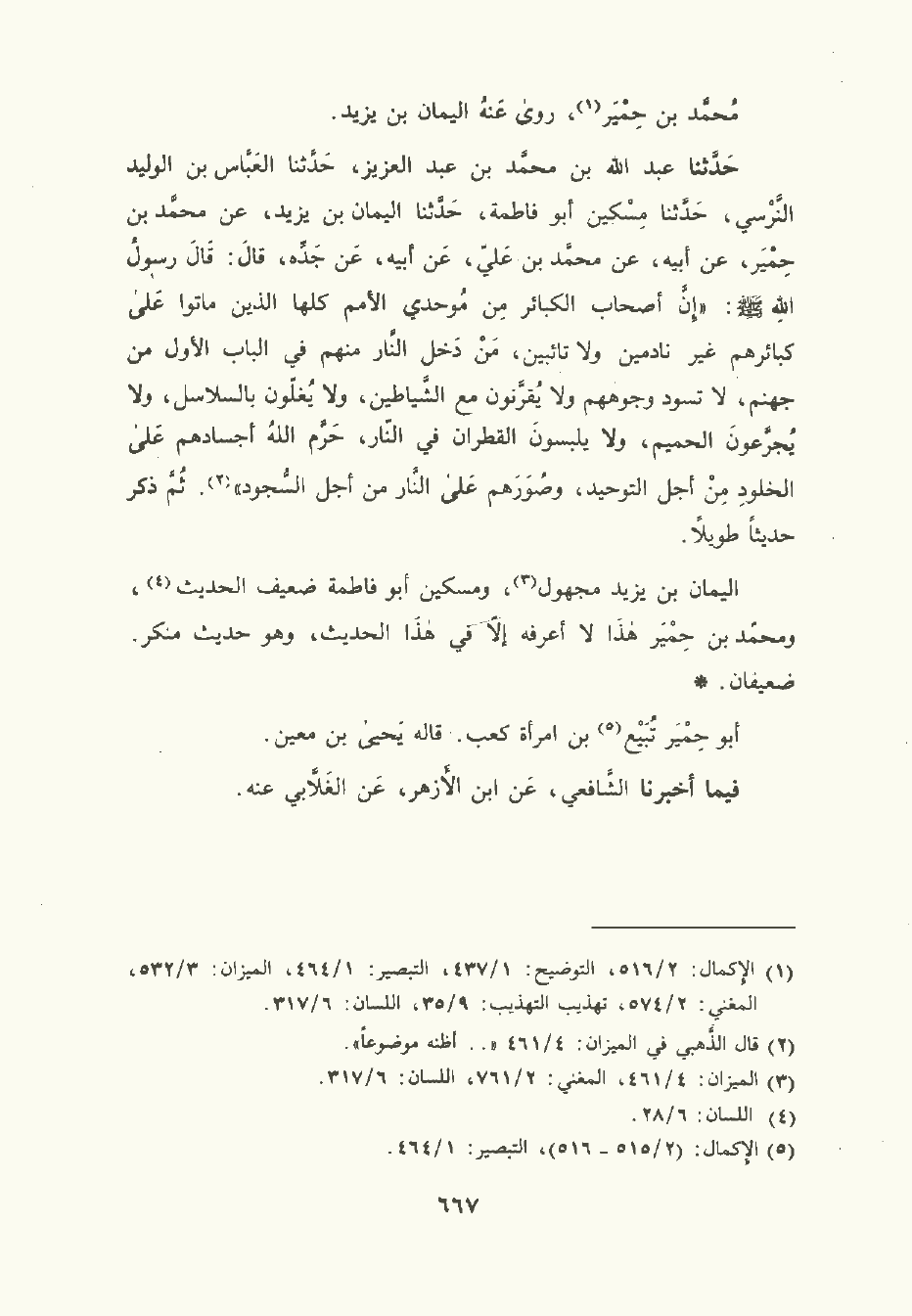 حَدَّثَنا عَبد الله بن مُحمَّد بن عبد العزيز , حَدَّثَنا العَبَّاس بن الوليد النرسي , حَدَّثَنا مسكين أبو فاطمة , حَدَّثَنا اليمان بن يزيد , عن مُحمَّد بن حِمْيَر , عن أبيه , عن مُحمَّد بن علي , عن أبيه , عن جده قال: قال رسول الله صلى الله عليه وسلم: إن أصحاب الكبائر من موحدي الأمم كلها الذين ماتوا على كبائرهم غير نادمين ولا تائبين من دخل النار منهم في الباب الأول من جهنم لا تسود وجوههم ولا يكرمون مع الشاياطين ولا يغلون بالسلاسل ولا يجرعون بالحيميم ولا يلبسون القطران في النار حرم الله أجسادهم على الخلود من أجل التوحيد وصورهم على النار من أجل السجود.